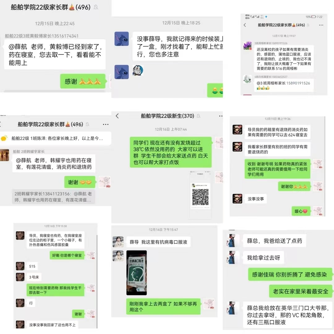 离校期间,一些家远的孩子们因为车次原因没能够早点回家,在校内的同学们陆续出现发烧现象,很多大连的家长在得知这个消息后第一时间与指导员老师取得联系,在冰雪的冬日为校内的孩子们送来退烧药物、感冒药物。除此之外,很多已经离校的同学也主动将自己封存在寝室的药物贡献出来,与校内同学们共度难关。指导员老师也带领着志愿者们为发烧同学们提供无接触式上门配送药物和送餐服务。点滴举动,汇聚成爱的海洋,我们众志成城,用温暖融化了整个寒冬。