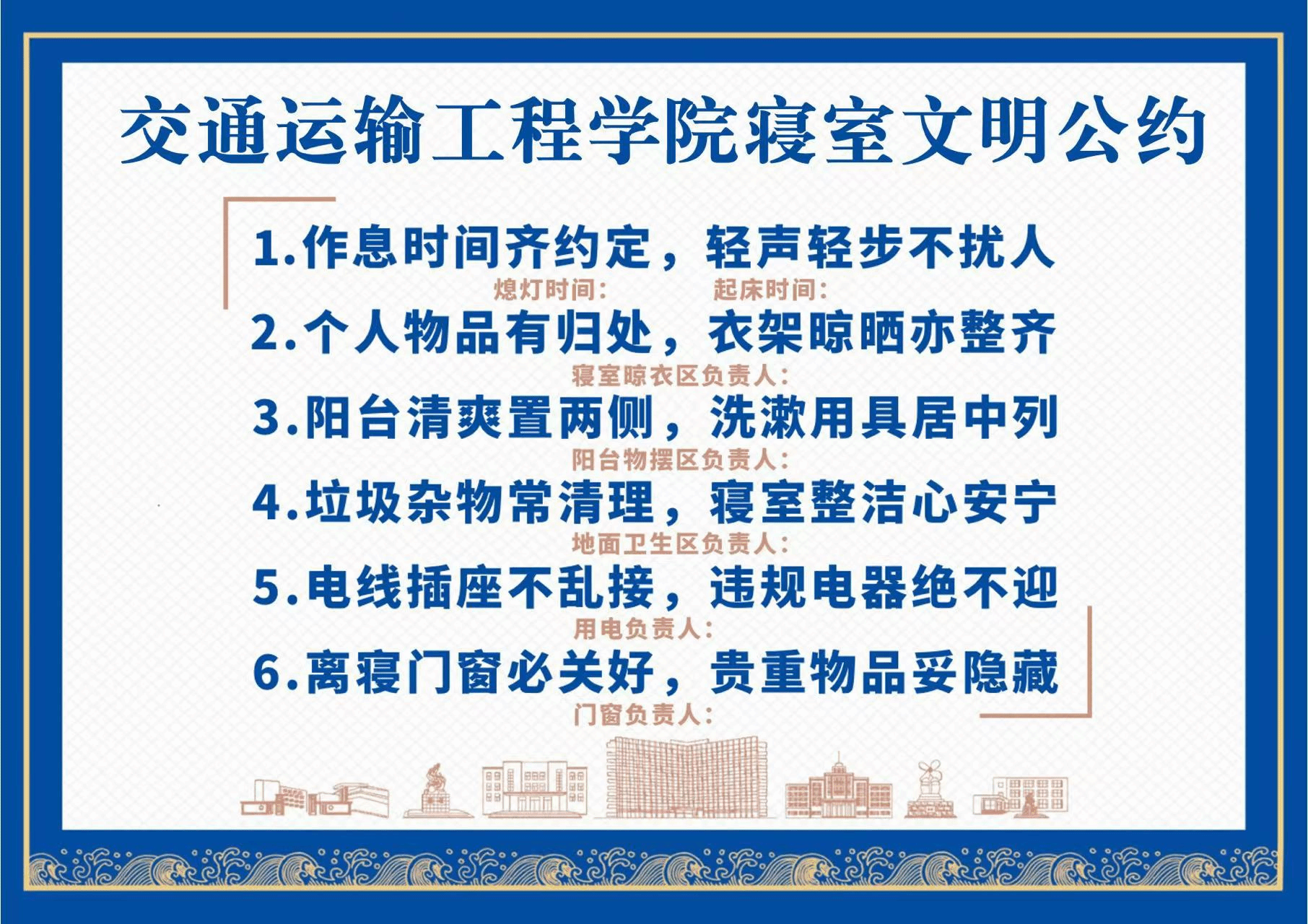 学院立足人才培养目标,从“管”和“建”两个维度持续深入开展寝室文化建设。一是以深化管理为基础。建立学院教管会、中队干部、寝室长三级管理体系;分年级制定寝室内务标准,健全管理、检查、评比和奖惩制度;组织制定寝室公约;明确公共区域管理责任人。把寝室建设责任落实到人具体到事,不断提升管理的精度和效度。