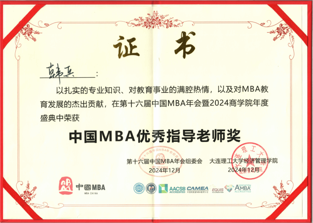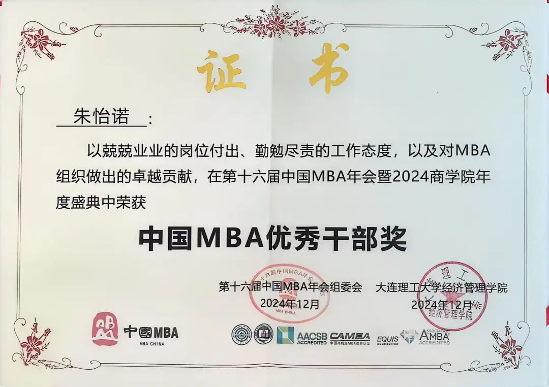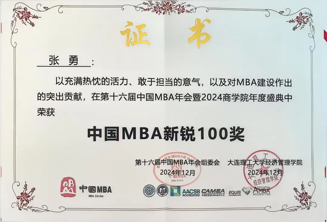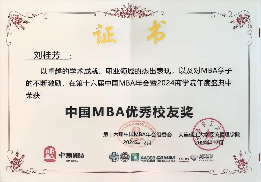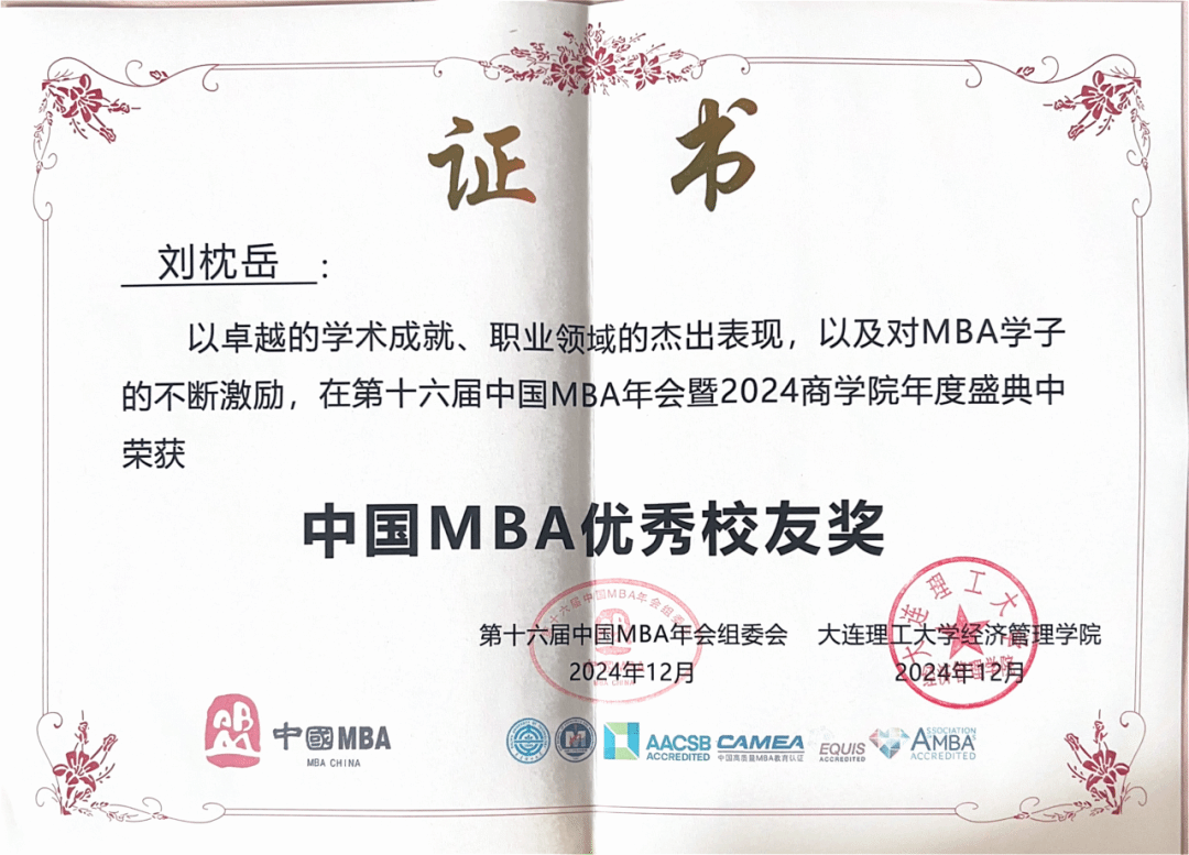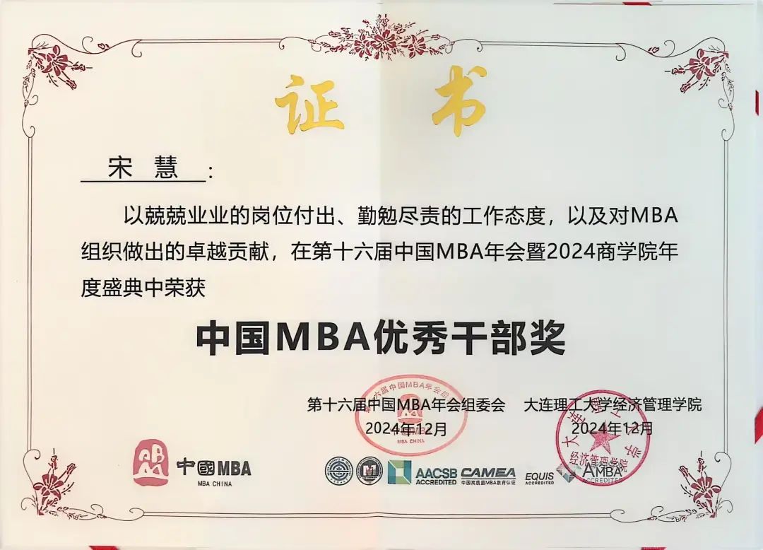 12月6日至8日,第十六届中国MBA年会暨2024商学院年度盛典在大连召开。我校航运经济与管理学院荣获“中国MBA十佳特色商学院”,MBA教育中心副主任韩兵教授荣获“中国MBA优秀指导老师奖”,大连连江五金矿产进出口有限公司营销总监刘枕岳、广州嘉迦供应链有限公司创始人刘桂芳荣获“中国MBA优秀校友奖”,MBA/MEM联合会主席宋慧、副主席朱怡诺荣获“中国MBA优秀干部奖”,MBA/MEM联合会原主席张勇、副主席高祺茗荣获“中国MBA新锐100奖”。