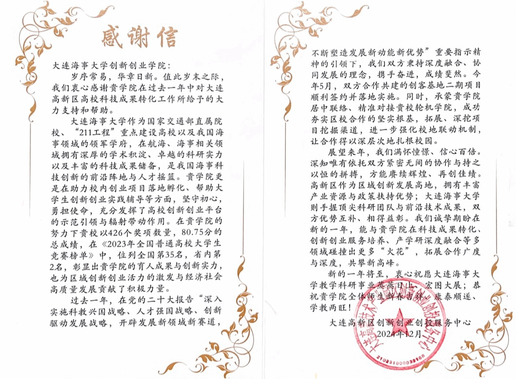 近日,大连高新区创新创业创投服务中心向大连海事大学创新创业学院送来感谢信,向过去一年学院对高新区高校科技成果转化工作所给予的大力支持和帮助表示衷心感谢。