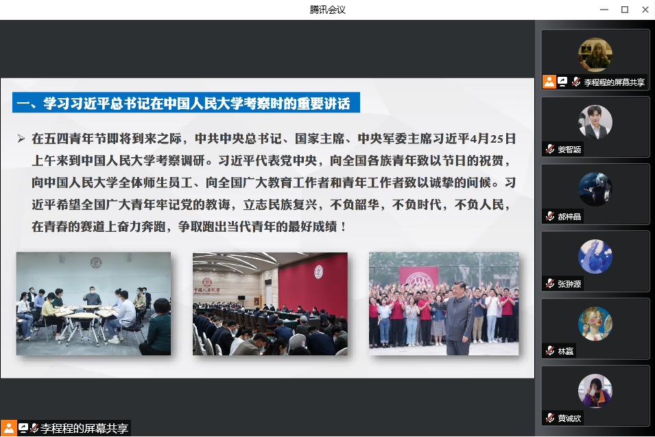 会上,王新婷分享了学习习近平总书记考察中国人民大学时的重要讲话精神体会,她表示,作为新时代的中国青年一定要坚定理想信念,增强自身本领,勇于担当奉献,把自身成长融入到中华民族伟大复兴的历史洪流中,争做堪当民族复兴重任的时代新人。