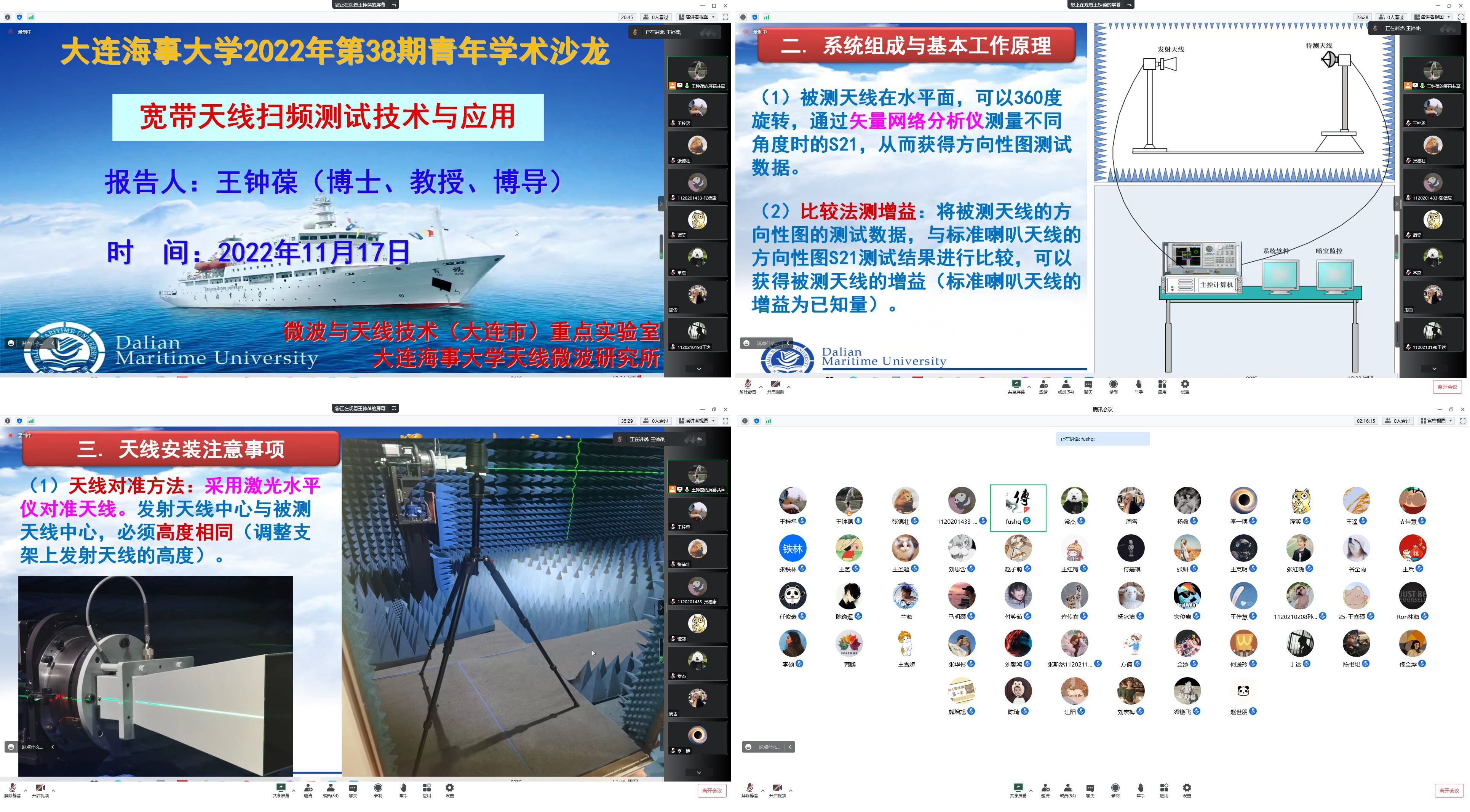主讲人信息科学技术学院青年教师王钟葆教授以宽带天线扫频技术为中心,介绍了宽带天线扫频测试系统的功能、组成和工作原理,详尽阐述了天线测试过程及注意事项,讲述了天线测试过程中使用的射频器件的分类、使用说明、使用注意事项及其日常维护与保养,并演示通过应用宽带天线扫频技术,测量天线的频率-增益曲线、频率-轴比曲线、角度-轴比曲线和预设频点的方向性图等天线性能曲线,并通过示例,讲解天线测试结果数据的处理和分析。