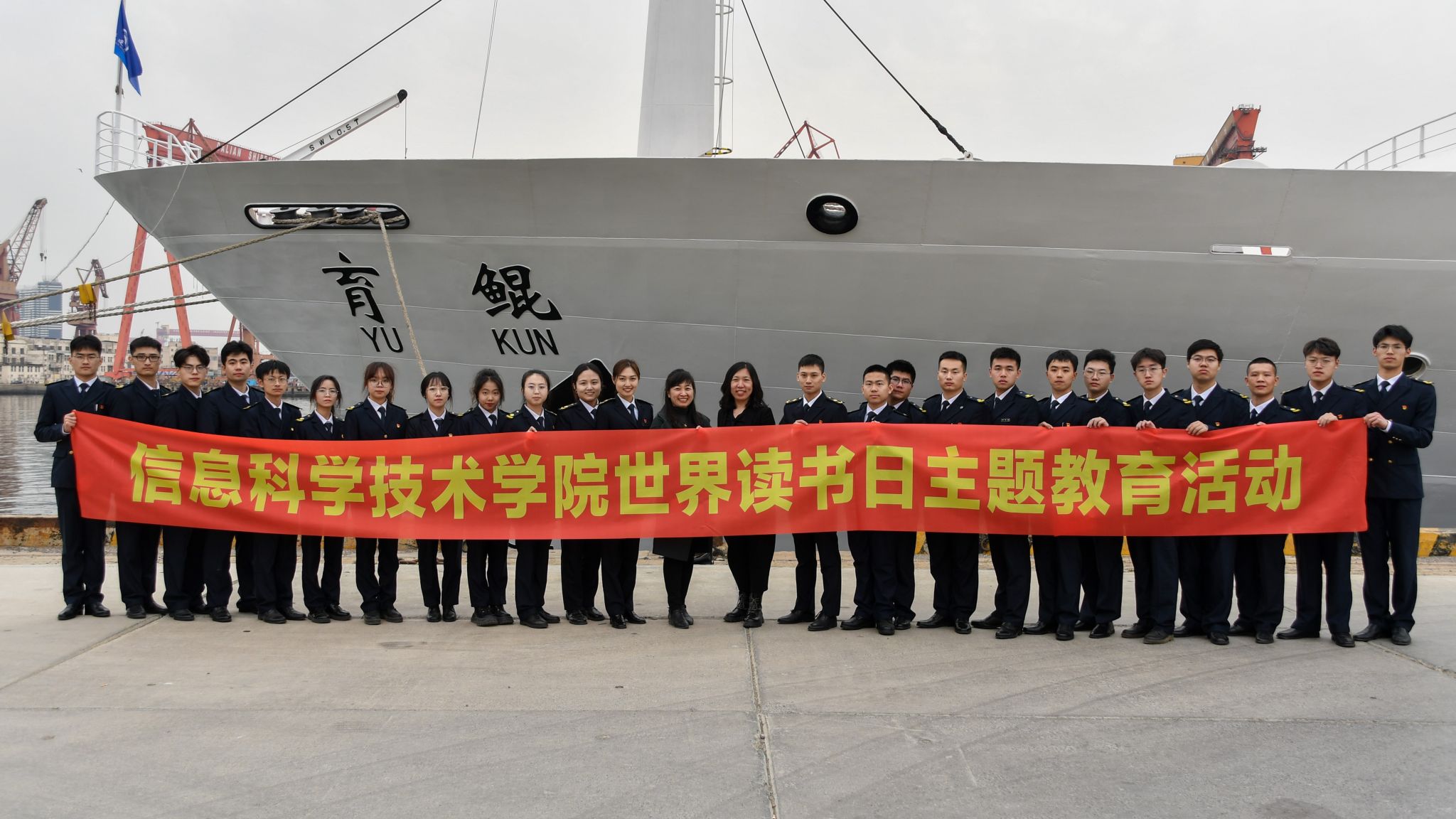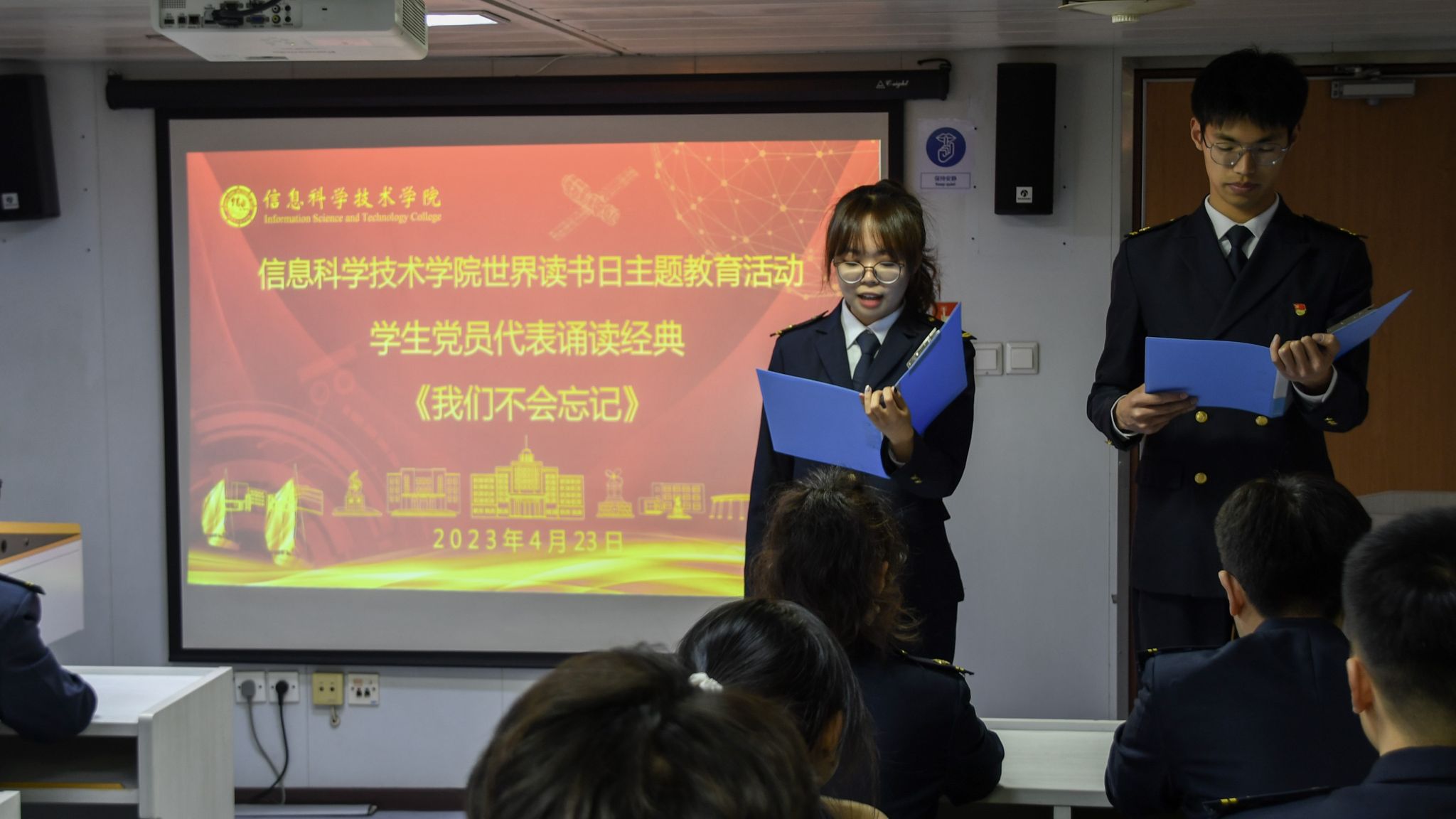 参观活动结束后,以世界读书日为契机,学生党员代表李丹萌、李政道诵读了经典《我们不会忘记》,在“育鲲”轮上回顾历史的同时,激励同学们为建设交通强国、海洋强国贡献自己的力量。