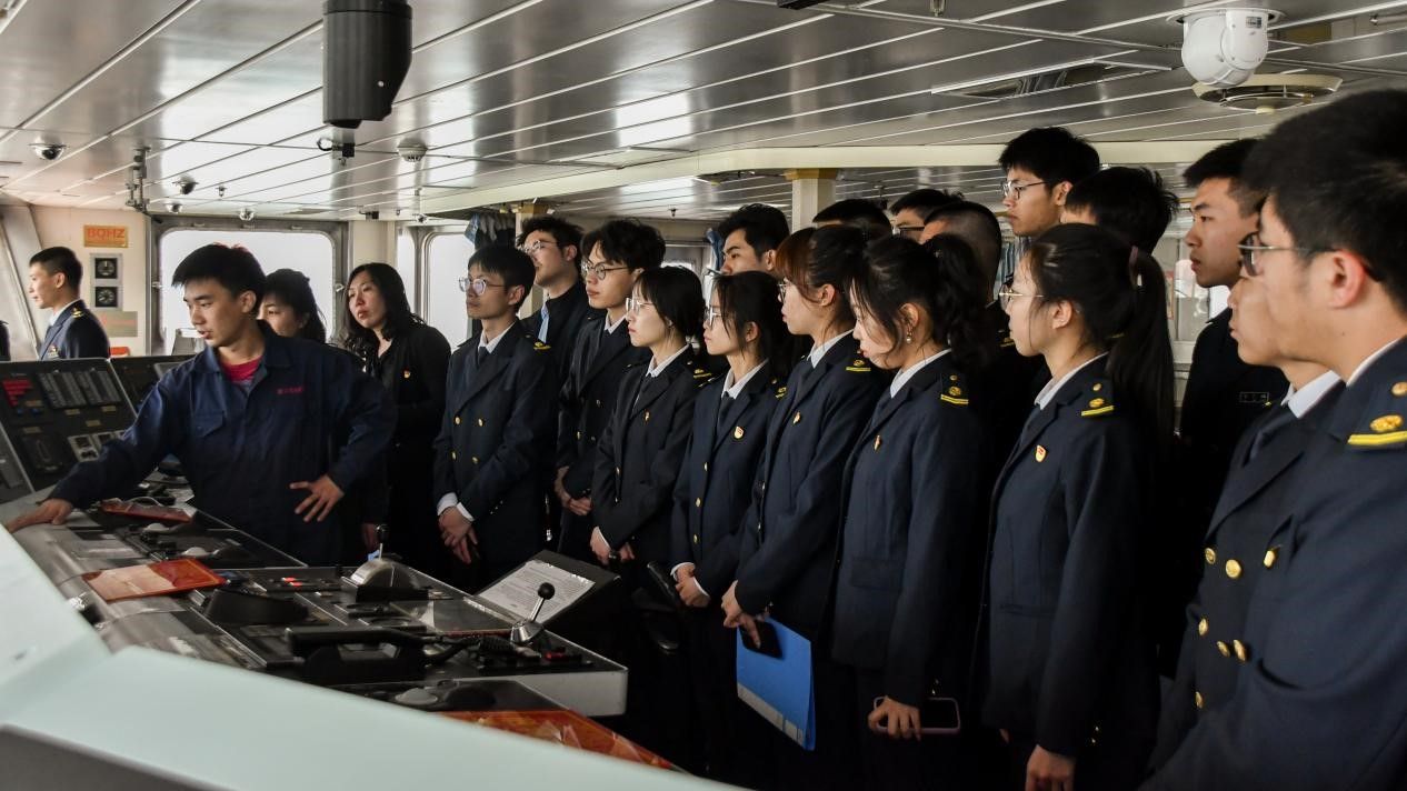 在本次“育鲲”轮参观实践中,师生党员在见习三副郭沐壮老师的带领下,先后参观了驾驶台、机舱和甲板等教学、生活以及工作场所,初步了解了船舶起航、靠泊和紧急情况下的工作流程,并观看了“育鲲”轮的介绍视频。参观活动中,同学们认真听讲、主动思考,结合所学专业与船上工作人员进行了深入的交流和互动。