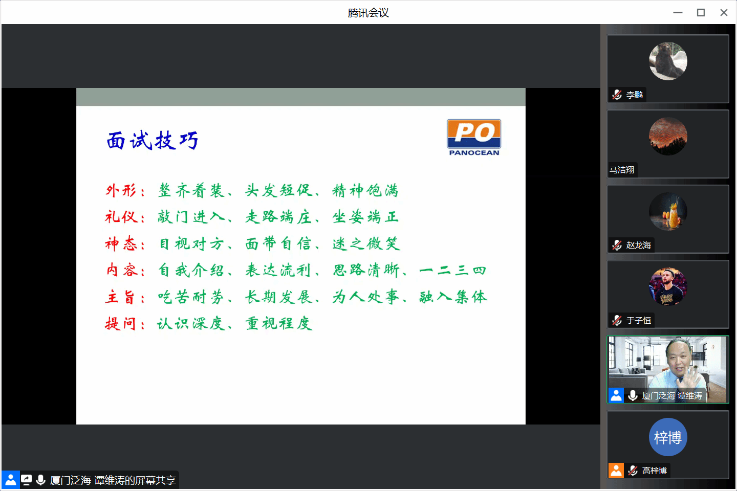 为帮助2024届本科毕业生掌握求职技能,提高求职本领,增强就业竞争力,5月5日晚,轮机工程学院通过线上方式举办简历制作及面试技巧专题讲座。厦门泛海国际船舶管理有限公司培训总监谭维涛应邀担任本次讲座主讲嘉宾。厦门泛海国际船舶管理有限公司董事副总经理周永煌、学院2020级指导员及本科生参加讲座。讲座由学院就业专项工作负责人高梓博主持。