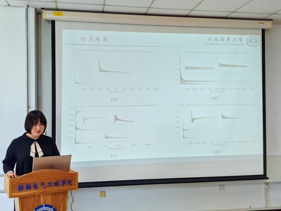 滕菲作了题为“基于对偶分解混合整数线性规划的港口综合能源系统分布式能源管理”的报告,介绍了当前绿色港口提高可再生能源利用率的常用措施,并重点阐述了如何计及港口中各种异构设备的运行机理,建立电-冷-热多能流耦合的港口综合能源系统能源管理模型。报告从港口实际运行需求出发,面向港口综合能源系统可靠性提出一种基于对偶分解混合整数线性规划的分布式能源管理策略,并通过数值仿真说明了所设计的方法对提高港口能源系统能源管理水平的有效性。