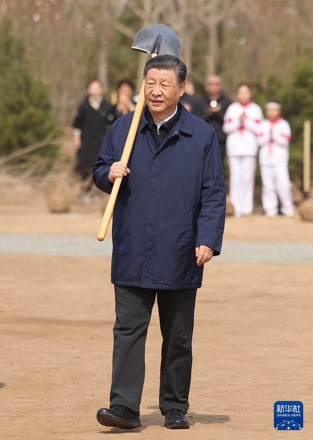 4月3日,党和国家领导人习近平、李强、赵乐际、王沪宁、蔡奇、丁薛祥、李希、韩正等来到北京市通州区潞城镇参加首都义务植树活动。这是习近平扛起铁锹走向植树地点。新华社记者 庞兴雷 摄