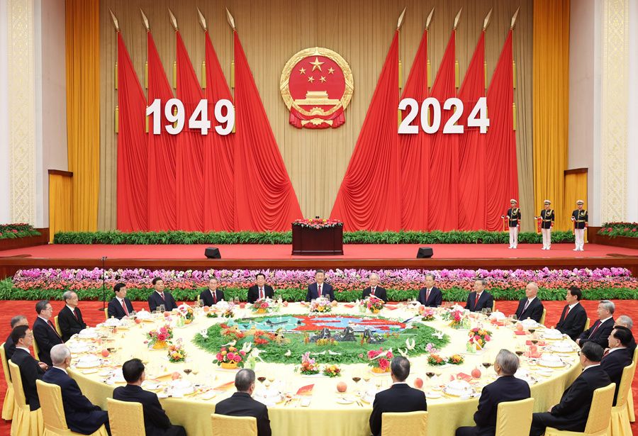 9月30日晚,庆祝中华人民共和国成立75周年招待会在北京人民大会堂隆重举行。中共中央总书记、国家主席、中央军委主席习近平出席招待会并发表重要讲话。新华社记者 谢环驰 摄