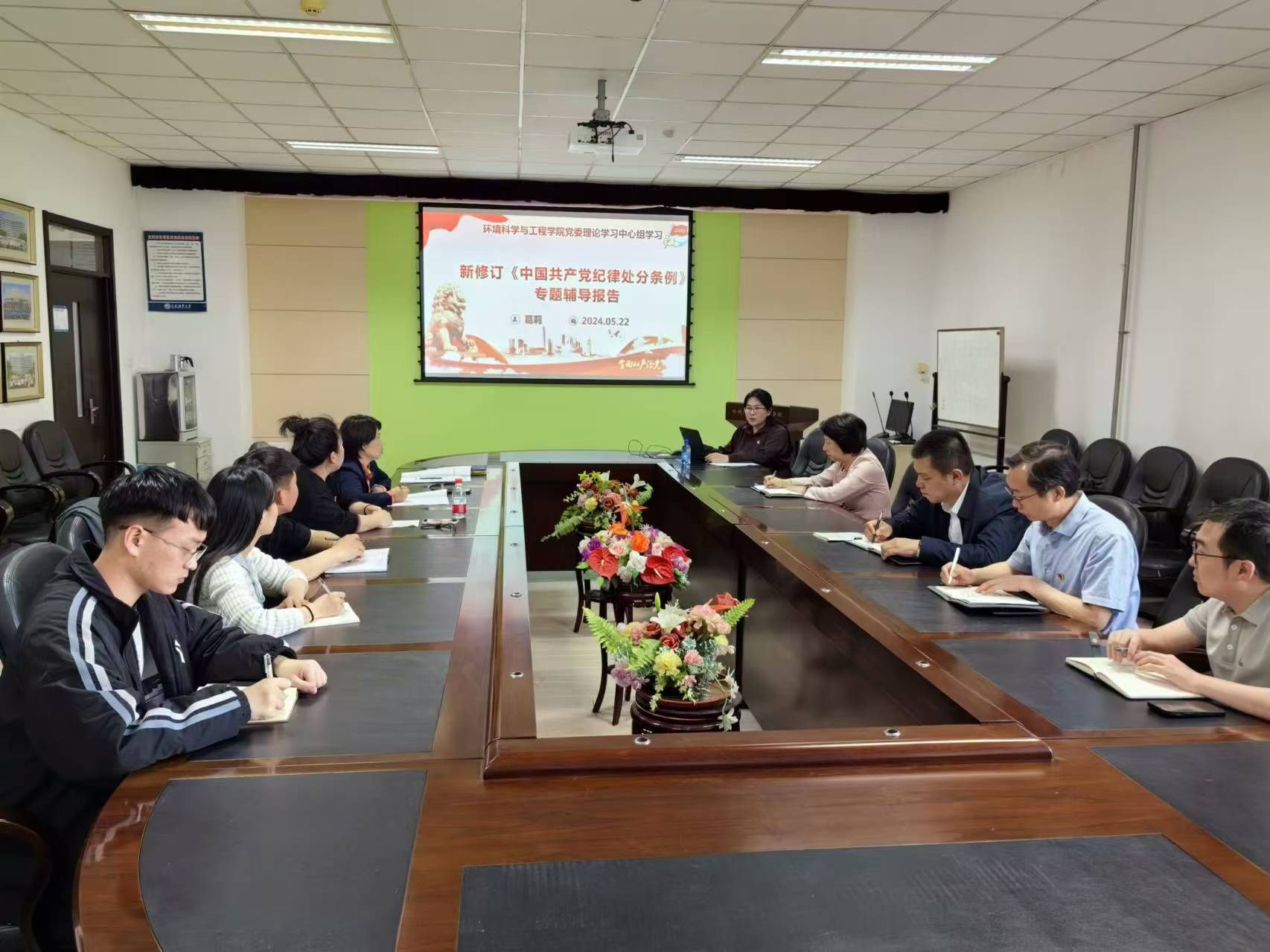5月22日下午,环境科学与工程学院党委在环工楼大会议室举行读书班《中国共产党纪律处分条例》专题辅导报告。会议由学院党委书记平强主持,报告邀请马克思主义学院葛莉教授作专题辅导,学院党委委员及党支部书记参加。