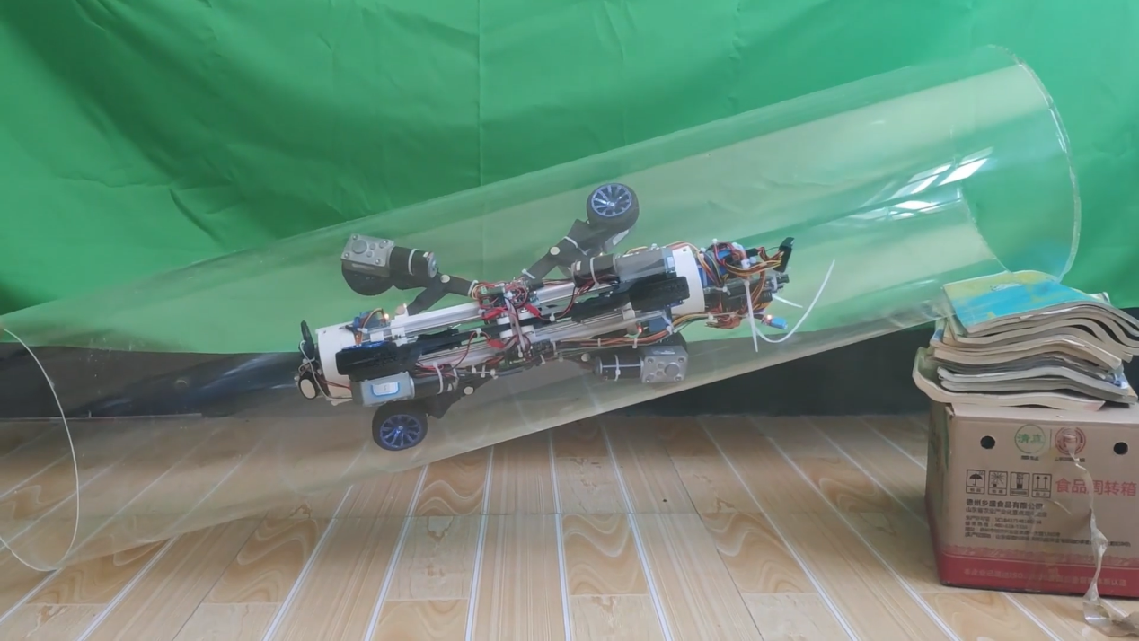 作品简介:管道运输是一种被广泛应用的物料输送手段,由于油气管道的长期使用很容易发生腐蚀穿孔情况,容易引发严重的人身和公共财产安全事故。因此管道也需要医生来定期“查体”,我们团队开发了管道医生—自适应变径式油气管道裂缝诊断机器人。 机器人采用六轮径向辐射支撑式结构,保证其有足够的驱动力,其独特的变径结构配合受力传感器、自动控制算法实现机器人在管道内的自适应调节,可以在不同半径下管道内稳定爬行。 此外,手机、电脑端可实时观测回传画面并结合人工智能算法进行管道裂痕自动诊断、不同的裂痕数据归类判级等,最终给出管道泄露预警结果。 通过外携其他设备,可利用手机控制,完成腐朽点定位、管道补漏等工作,其拓展性高。