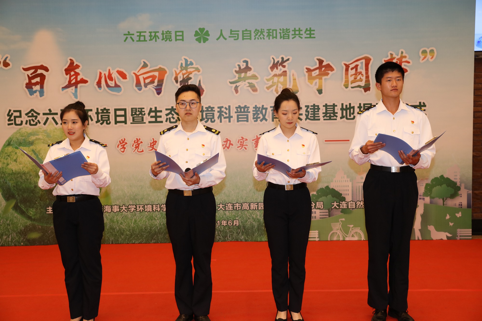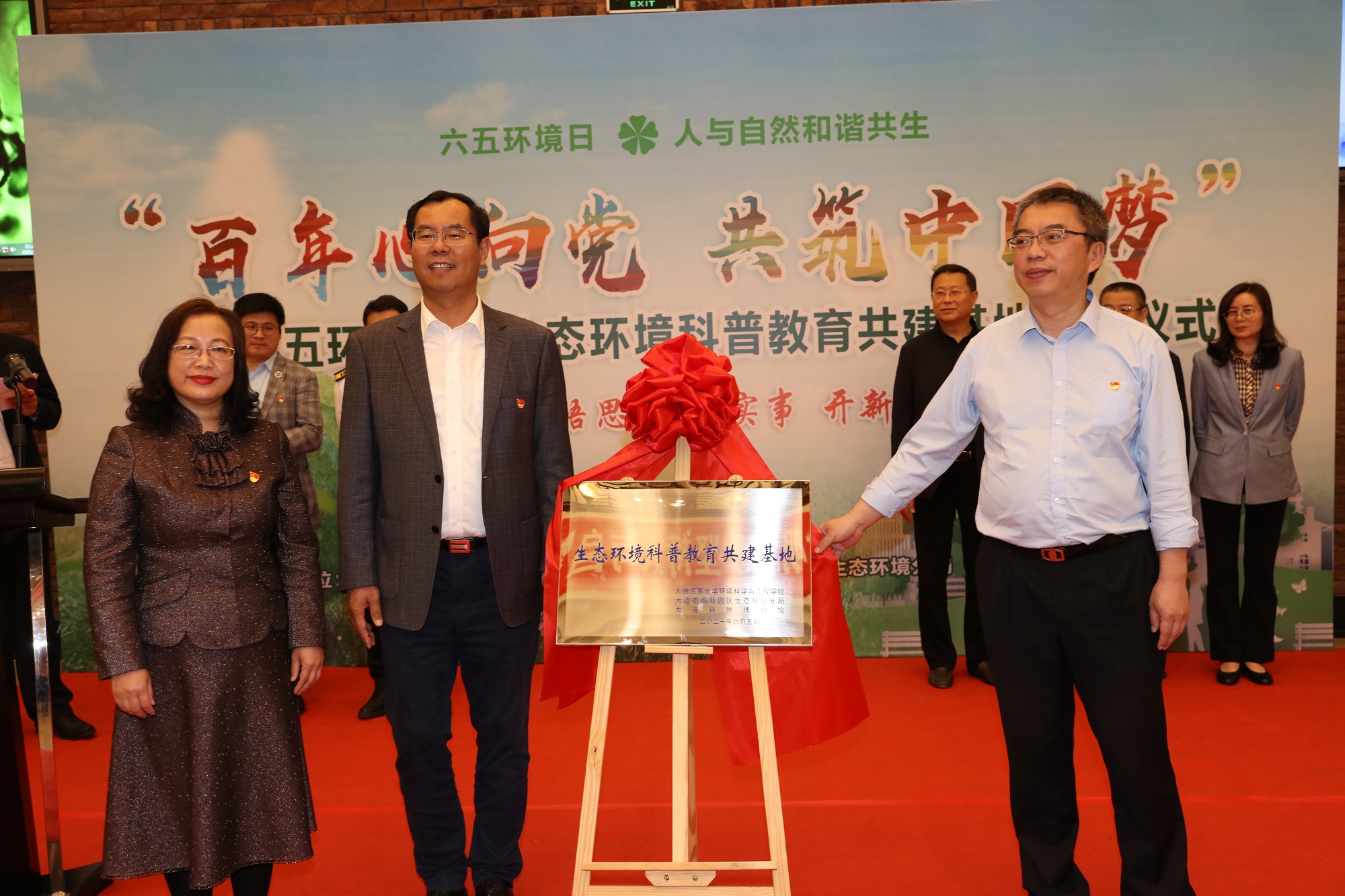 为深入贯彻落实习近平生态文明思想和党史学习教育要求,献礼建党100周年,在第50个世界环境日来临之际,大连海事大学与大连市生态环境局、大连市公共文化服务中心三家单位携手同行,于6月2日在大连自然博物馆共同举办“百年心向党,共筑中国梦”纪念六五环境日暨生态环境科普教育共建基地揭牌仪式。大连海事大学纪委书记罗钟山、大连市生态环境局副局长张泽勇、大连市公共文化服务中心副主任杨颖、大连市高新园区生态环境分局局长李春胜、大连市公共文化服务中心宣传策划部部长刘成立、大连自然博物馆馆长赵博、大连海事大学党委学生工作部部长王义波、大连市生态环境服务中心副主任杨安丽及以上三家单位的相关领导、老师和同学们参加了仪式。仪式由大连海事大学环境科学与工程学院党委书记平强主持。