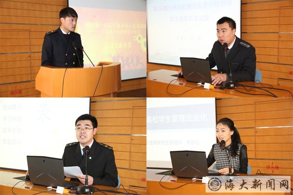 会上,汇报交流人员结合自己的学习培训经历,围绕高校辅导员职业能力提升、学生管理法治化、辅导员工作课程化模式、大学生党建工作、突发事件与公共危机应急管理、辅导员网络应用能力提升、少数民族学生教育管理服务理论与实践、学业能力指导等主题,从主要内容、心得体会及对我校学生工作的启示和借鉴等三个方面开展交流。交流内容理论性强、案例丰富,贴近实际,给人以启迪和思考,受到了全体参会学生工作干部的欢迎。