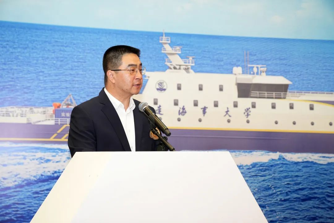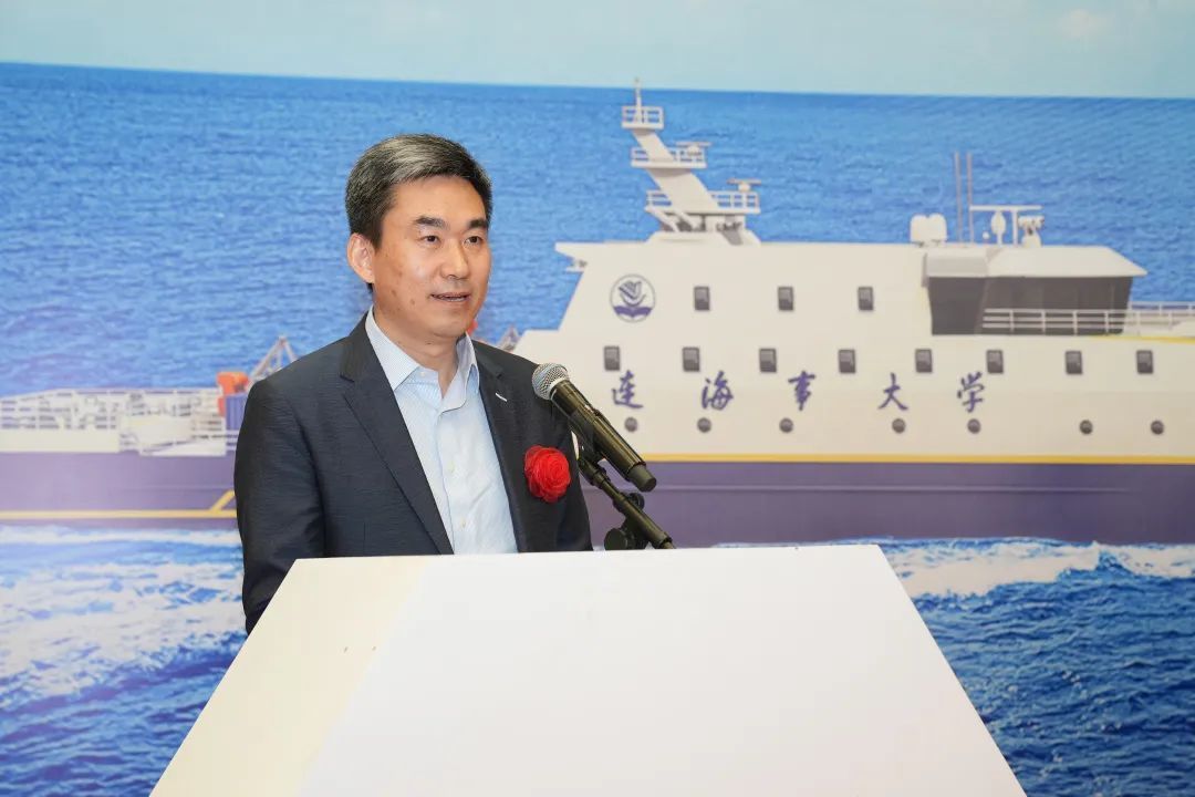 初北平代表大连海事大学致辞。他对中远海运集团和万敏董事长给予该项目的重视表示感谢,对大连中远海运重工有限公司、中国船级社大连分社对该项目的付出表示感谢。他表示,两用船的建造承载着交通运输行业智能航运先导示范应用的重大责任,承载着我国无人驾驶船舶技术在国际领域立足站稳的重要使命,也承载着海大全体师生员工和海内外校友的满心期待。该船的成功建造将对海大乃至交通运输行业智能航运的人才培养和科学研究产生重要且深远的影响。他希望,三方在建造过程中能积极配合,充分沟通,攻坚克难,将两用船打造成标杆产品、明星产品,共同为国家智能航运、海运强国、海洋强国贡献力量。