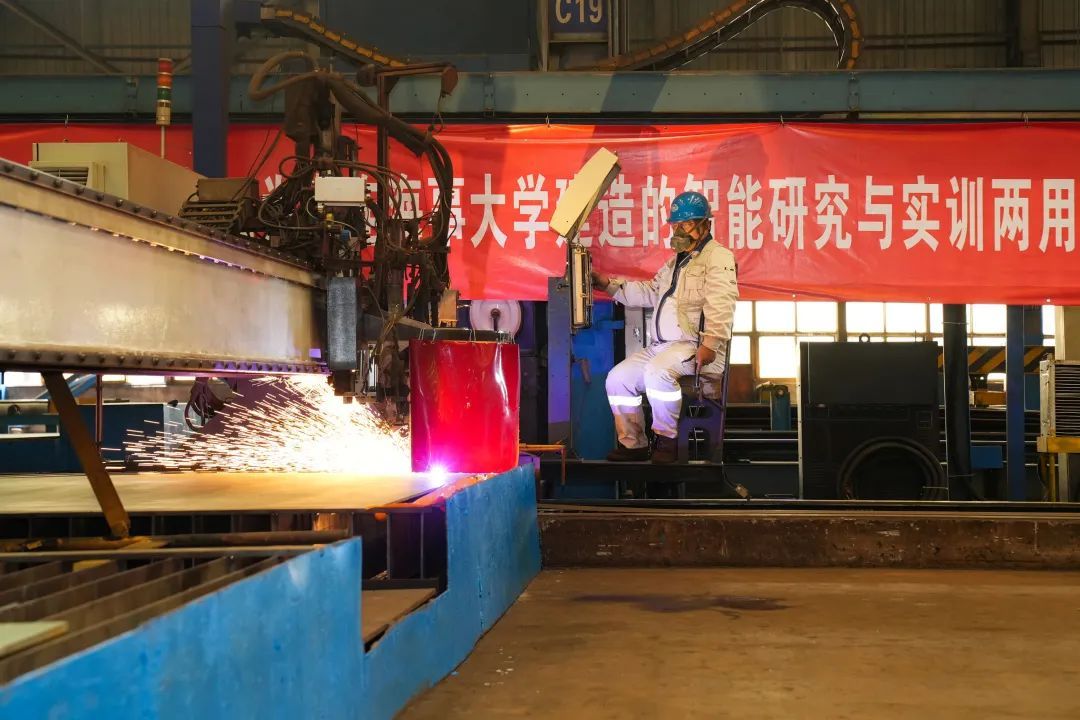上午十点五十八分,王彧、张辉、王小勇共同按下开工启动水晶球,智能研究与实训两用船首块钢板被顺利切割,大连海事大学、中国船级社大连分社、中远海运重工有限公司相关部门和单位代表共同见证了这一激动人心的时刻。