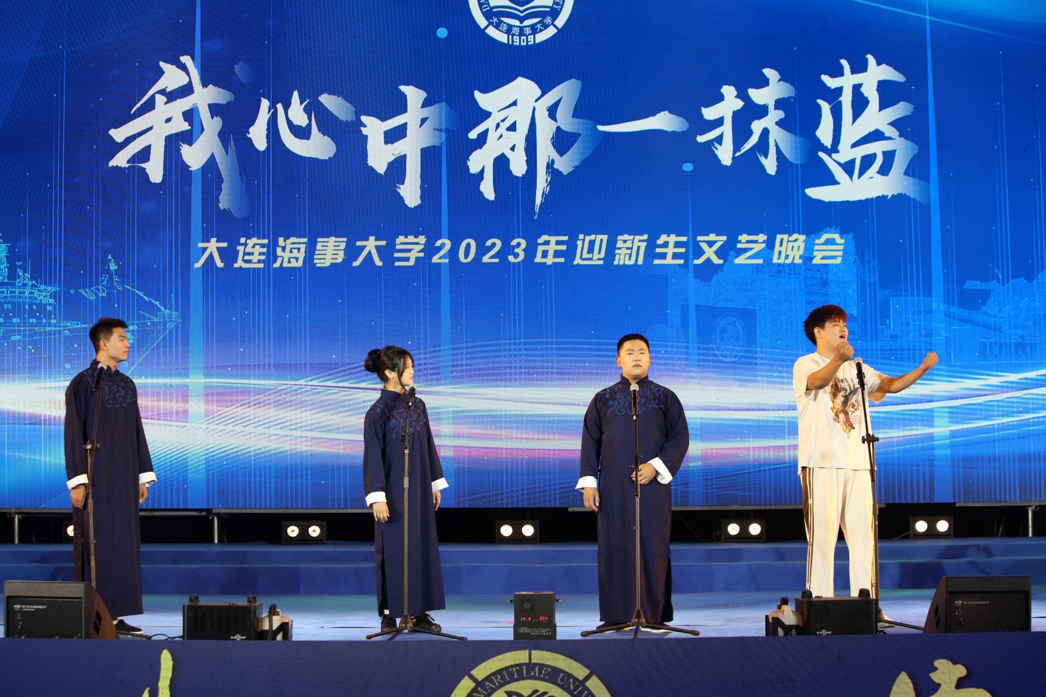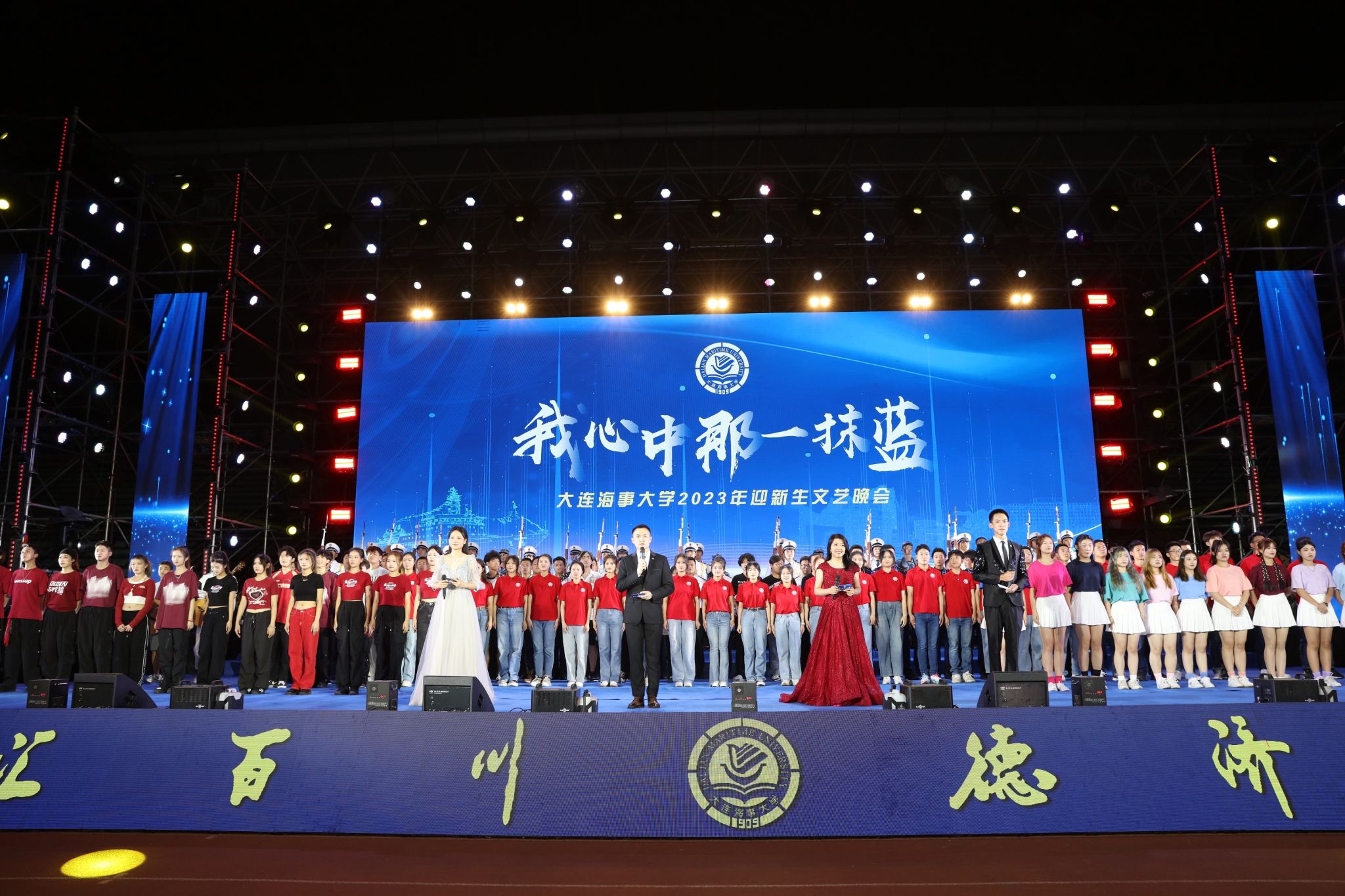 9月3日晚,大连海事大学“我心中那一抹蓝”2023年迎新生文艺晚会在西山体育场如期举行。全体2023级新生,校领导许民强、单红军、罗钟山、初北平,教师代表,机关职能部门负责人,各学院党政负责人,教辅单位负责人及全体新生指导员和承训教官观看晚会。