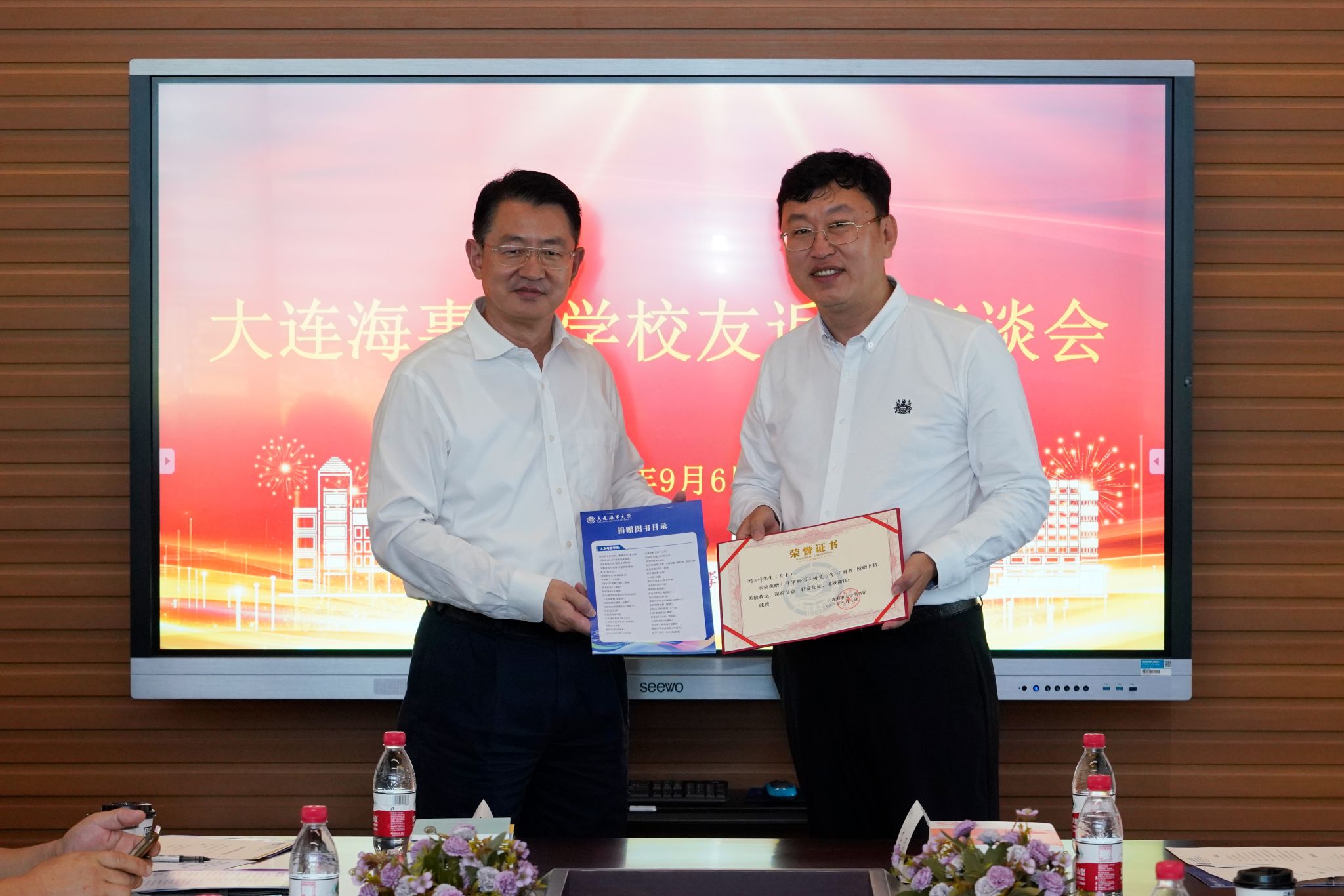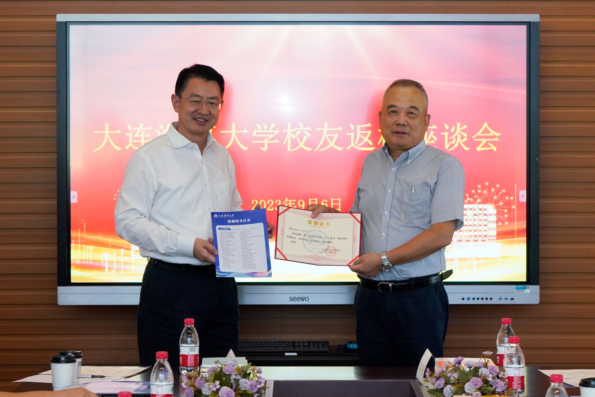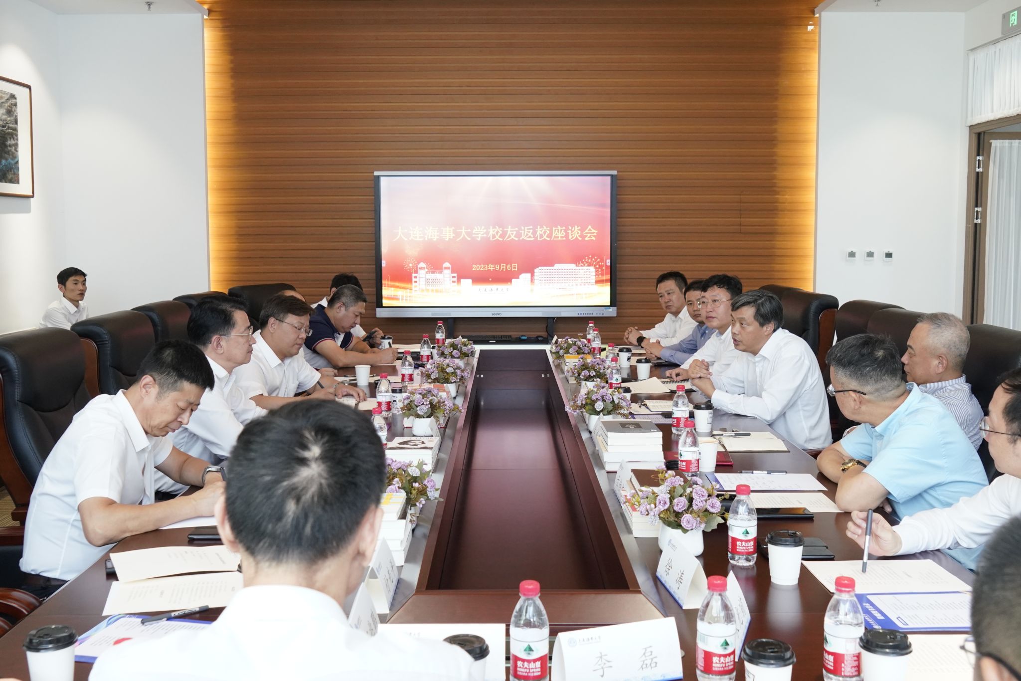 9月6日,北京校友会秘书长、87级校友金赫,副秘书长、95级校友褚云峰,中海油服船舶事业部党委书记、总经理、94级校友唐海波,山东海运副总经理、90级校友徐涛一行返回母校,向母校捐赠图书并发起设立“校友常回家看看基金”,校长单红军会见北京校友会一行并座谈,校友事务与合作处处长杨新宇主持座谈。