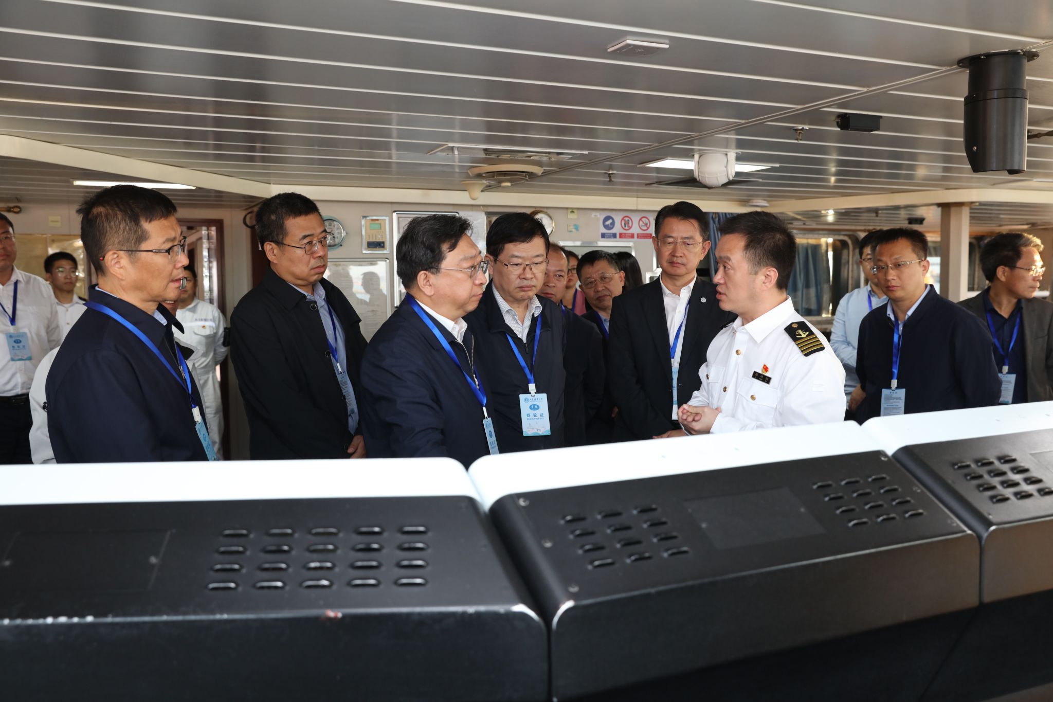 “育鲲”轮船长李连博介绍了船舶的总体情况及科普活动开展情况。随后,调研组一行参观考察了“育鲲”轮驾驶室、机舱、甲板、船载救生艇和船员宿舍等区域,并就如何在教育 “双减”中做好科普加法与学校进行交流。