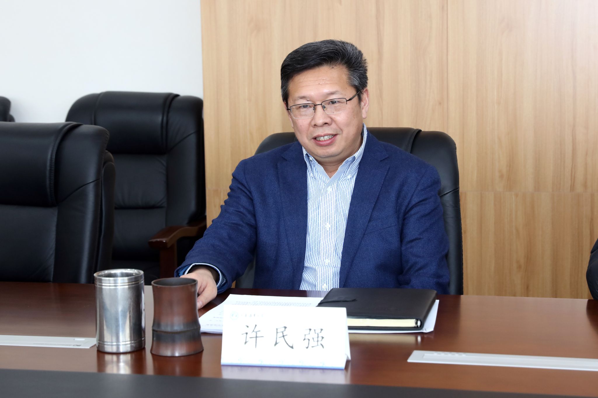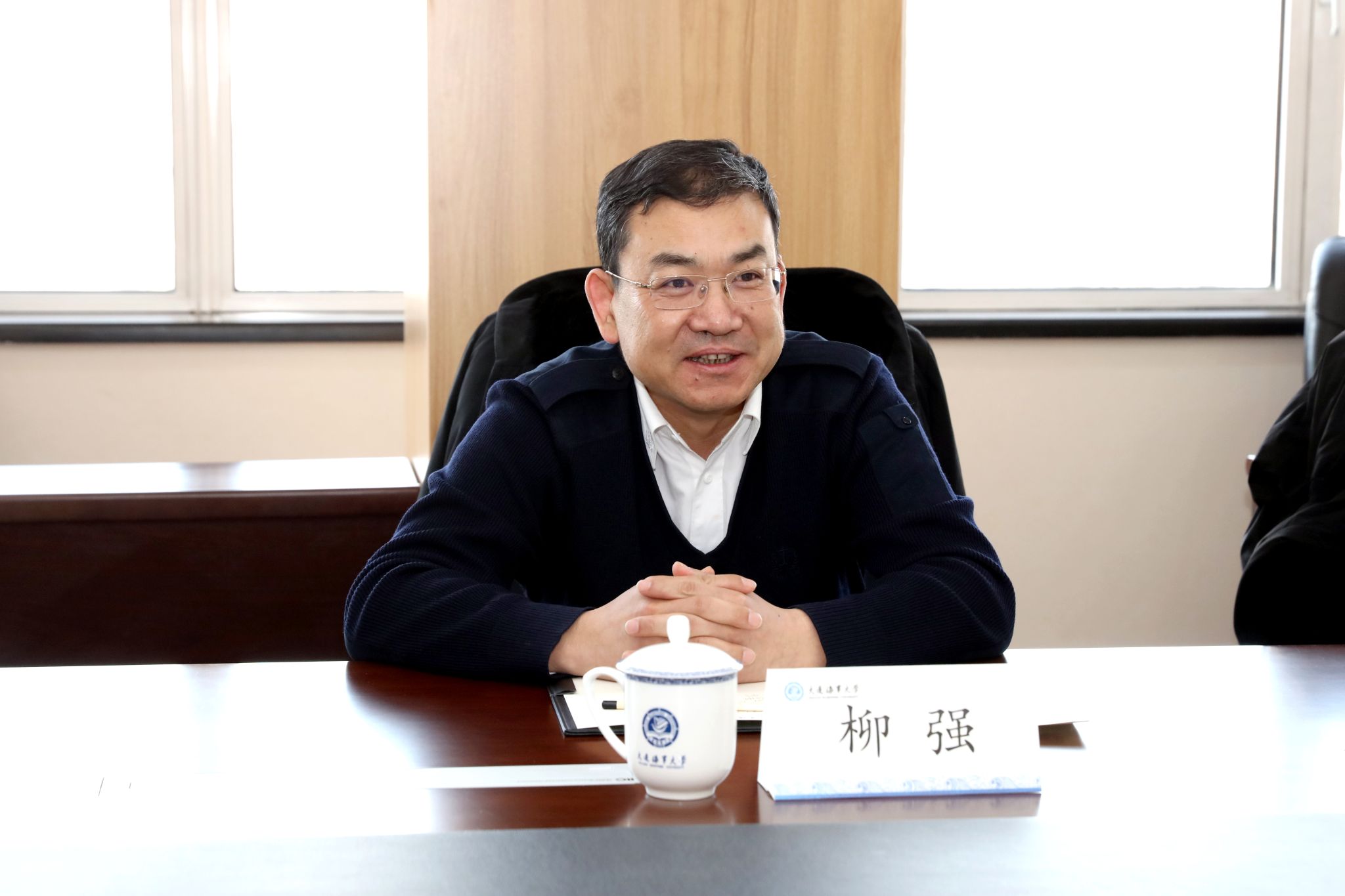 2月29日下午,山东海事局副局长柳强、综合计划处处长周尊山、指挥中心副主任罗永宏一行来访我校,学校党委书记许民强在综合楼822会议室会见柳强一行并进行座谈交流。