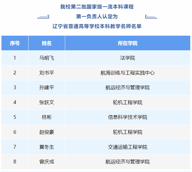 近日,辽宁省教育厅发布《关于公布2023年辽宁省普通高等学校本科教学名师遴选结果的通知》(辽教通〔2024〕56号)、《关于认定第二批国家级一流本科课程第一负责人为普通高等学校本科教学名师的通知》(辽教通〔2024〕55号),我校共14名教师入选,其中学校推荐的马鹤丹等6名老师全部获评教学名师,第二批国家级一流本科课程第一负责人马明飞等8位教师被认定为辽宁省本科教学名师。