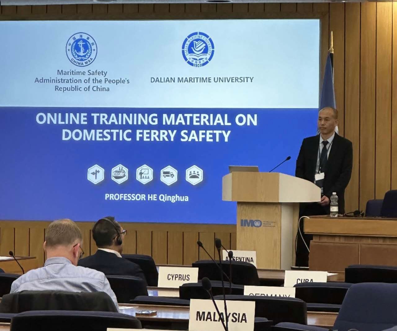 在教材审议之前,我校航海学院何庆华教授代表开发团队向IMO秘书处和全体成员国代表介绍了教材的主要内容。教材审议期间,新加坡、比利时、意大利、巴拿马等15个国家代表发言对我方的工作表示感谢和支持,对教材内容的专业性表示肯定和赞赏。最后,会议一致通过将该教材推荐给各成员国使用。