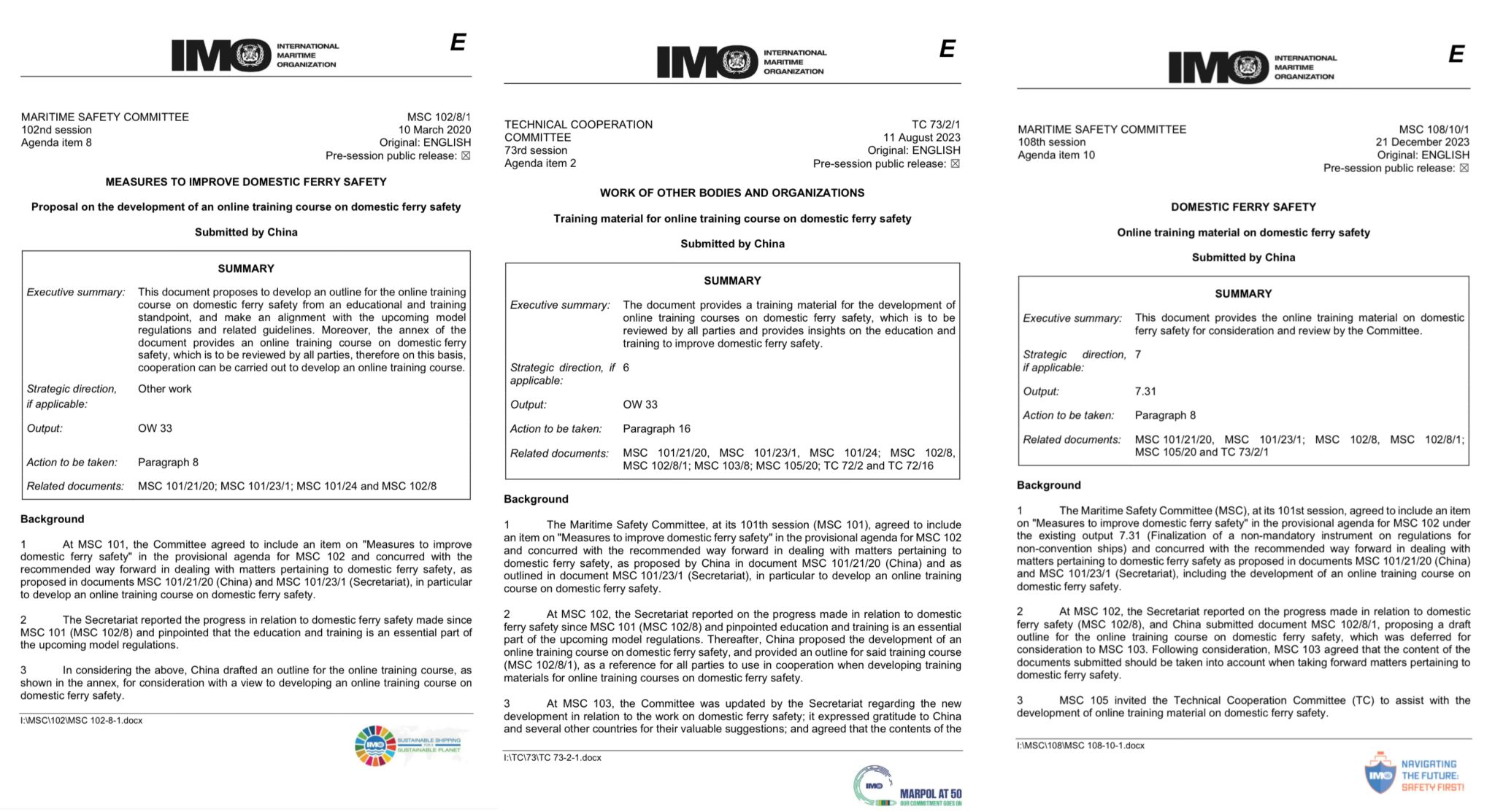 2018年12月,在IMO海上安全委员会第100届会议上,中国提出的“加强渡运安全合作”的倡议得到了广泛认同,并在后续的会议上正式设立了渡运安全议题。经多方努力,IMO于2021年同意由中国承担渡运安全培训教材的开发任务。在交通运输部国际合作司的统一部署和领导下,驻英使馆海事专班、交通运输部海事局和学校明确分工、密切合作,共同推进渡运安全议题下各项工作的开展。学校组建了以航海学院教授和专家为主体的教材编写组,面对示范性要求高、无范例可循等实际问题,编写组克服重重困难,从以往远洋船员教育与培训的经验中寻求共性,突出渡运特点,搭建教材框架;逐一对照《IMO渡运安全示范规定》条款确定教材内容,以便紧扣IMO对教材开发的要求;借助广东海事局承办的东盟地区论坛争取各东盟国家的支持,增信释疑,寻求共识;通过走访广东海事局、辽宁海事局和中远海运客运等国内多家单位征求意见,力求教材内容贴合行业实际。从无到有,由粗到精,历经四年的编纂和悉心打磨,高质量地完成了编写任务,得到了部国际合作司和部海事局的高度认可。我校按部国际合作司的工作计划,于2023年向IMO 技术合作委员会第73届会议(TC 73)提交了精简版教材,获得了IMO秘书处的赞赏和成员国的广泛关注。经驻英使馆海事专班的不懈努力,争取到了在教材审议之前的宣介机会,为教材在本届会议上的成功通过扫清了障碍。