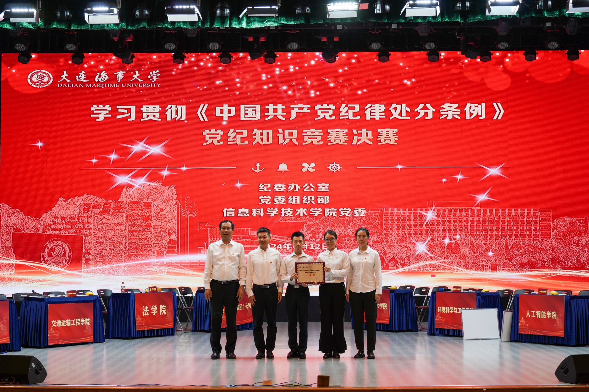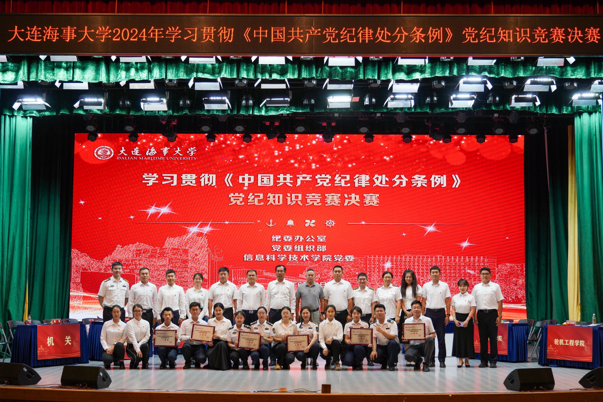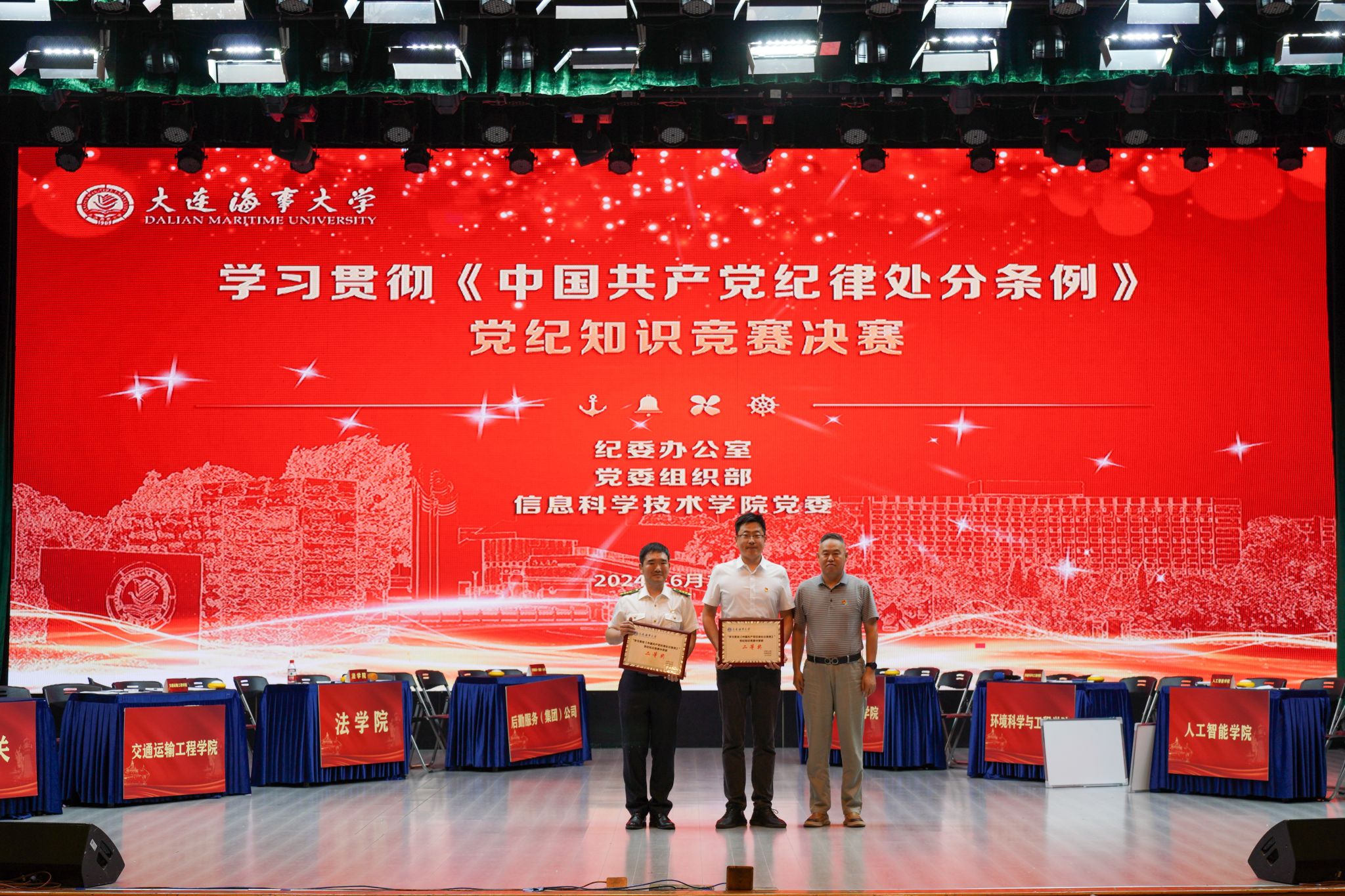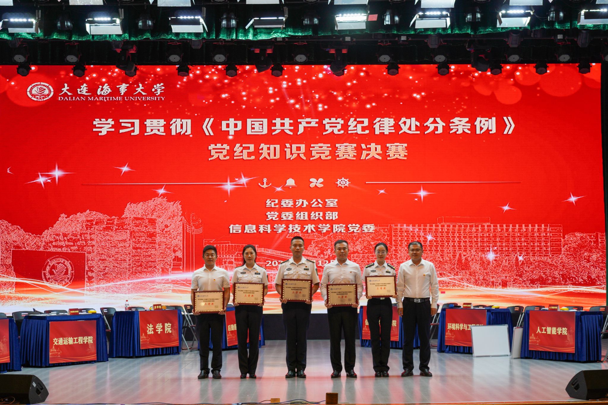 经过激烈比拼,机关代表队荣获一等奖,轮机工程学院代表队、后勤服务(集团)公司代表队获得二等奖,信息科学技术学院代表队、交通运输工程学院代表队、环境科学与工程学院代表队、法学院代表队、人工智能学院代表队获得三等奖。航海学院等13支代表队获得优秀奖。