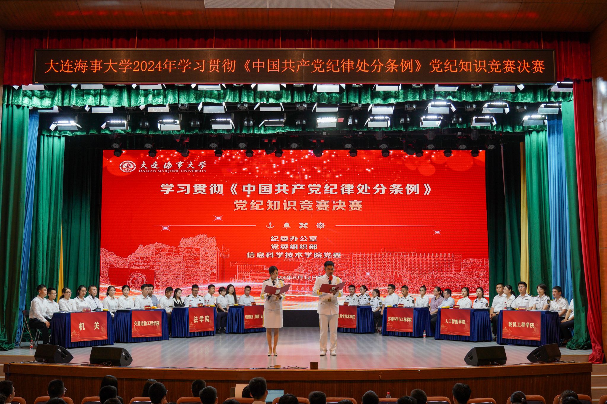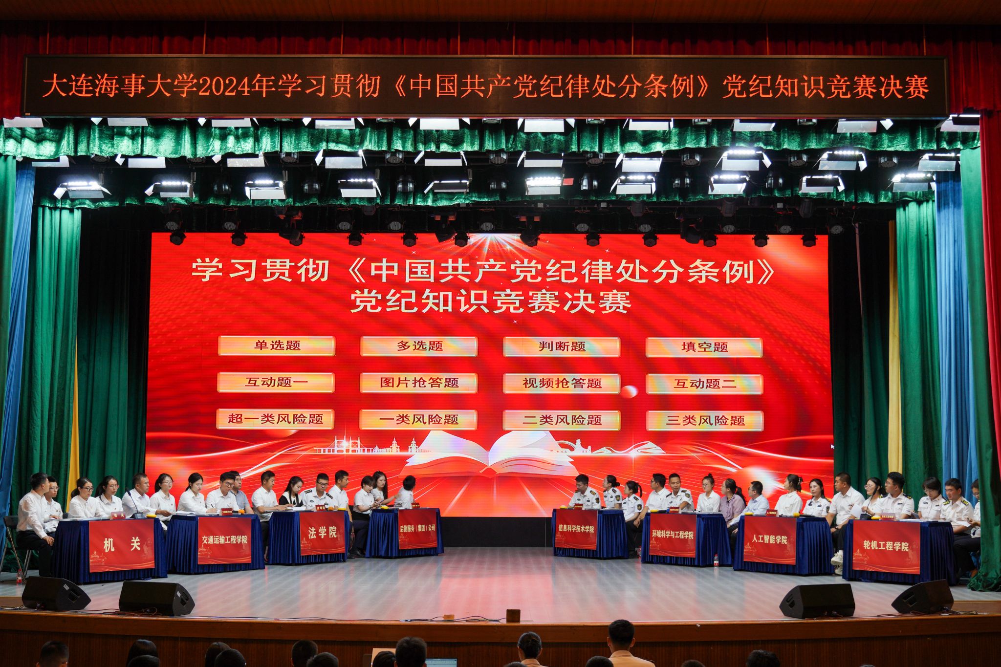 经初赛环节,共有机关、轮机工程学院、信息科学技术学院、交通运输工程学院、环境科学与工程学院、法学院、后勤服务(集团)公司、人工智能学院等八支代表队入围决赛。比赛分必答题、抢答题、风险题三个环节,通过选择题、判断题、填空题、简答题、案例题等形式对新版《条例》内容进行综合考核,比赛还融入了漫画、视频等形式,既严肃又不失活泼,给在场的干部师生呈现了一堂生动的党纪教育课。