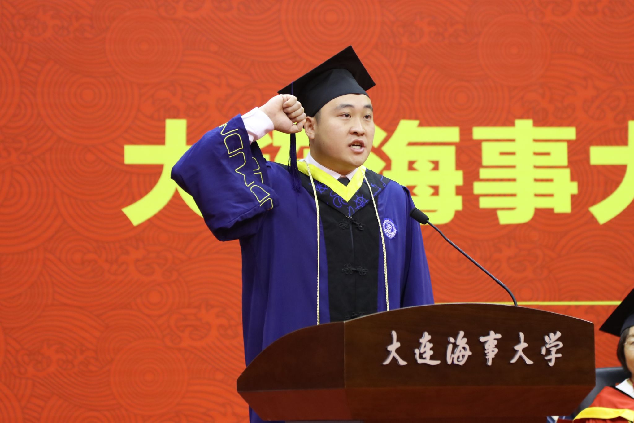 本科生代表闫畅同学回忆了自己在海大四年的求学生涯,表达了对海大、对老师、对同学、对父母的感谢,展现出不断进取的决心和信心,表示将以航海家的姿态,在中国式现代化进程中挺膺担当,贡献海大力量。