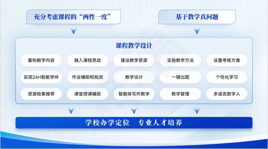 在建设过程中,充分考虑了课程的“两性一度”,基于教学真问题对课程教学进行设计,主要包括重构教学内容、融入课程思政、建设教学资源、实施教学方法、设置考核方案,实现24H智能学伴、作业辅助和批改、教学设计、一键出题、个性化学习、资源检索推荐、课堂授课辅助、智能体写作教学、教学管理和多语言数字人等场景应用,让课程真正服务于学校办学定位、专业人才培养目标。