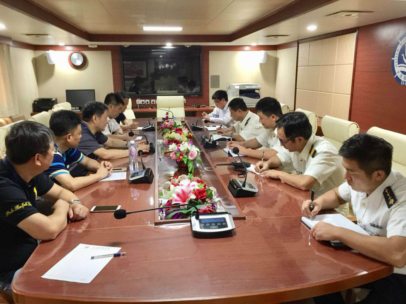 在高级船员座谈会上,刘正江代表学校对全体工作人员的辛勤付出表示感谢。他听取了“育鹏”轮领导、指导教师及指导员关于07和08航次学生实习情况和船舶安全运营情况的汇报。他表示,确保“育鹏”轮安全运营是保障学生教学实习的前提,他勉励大家继续努力,将“育鹏”轮打造成为中国航海实习船队成员船安全运营管理和综合使用管理的标杆。