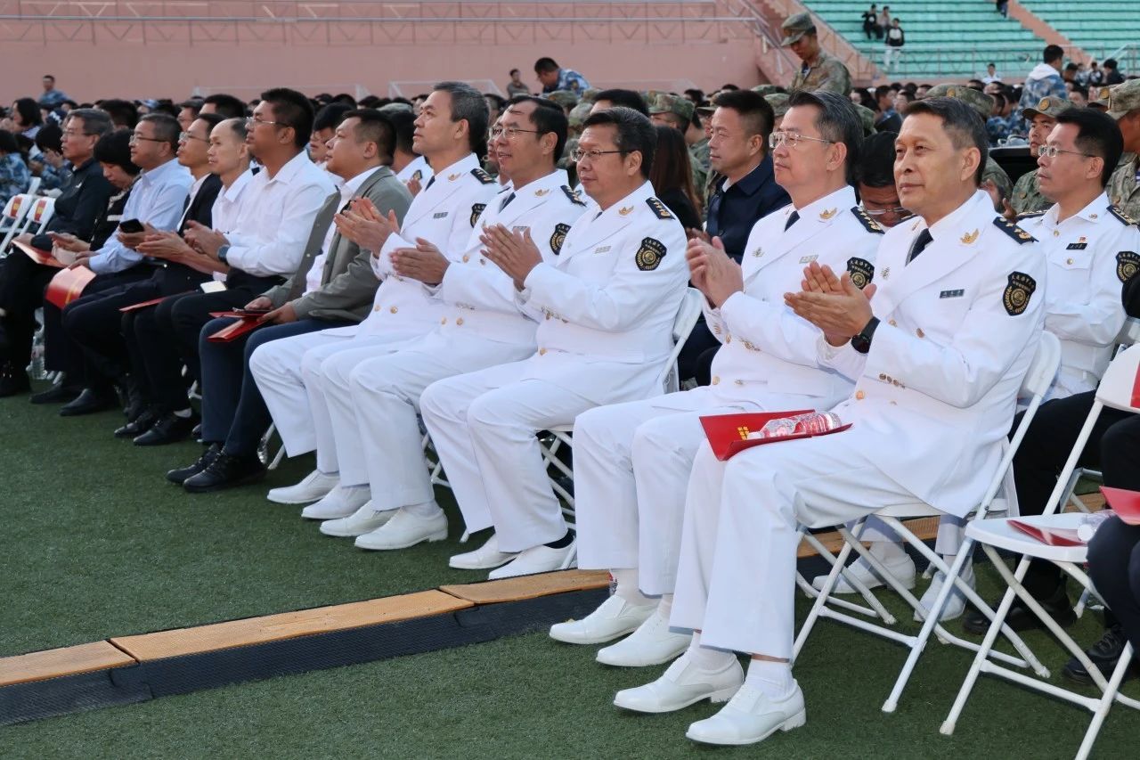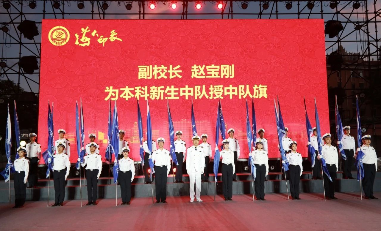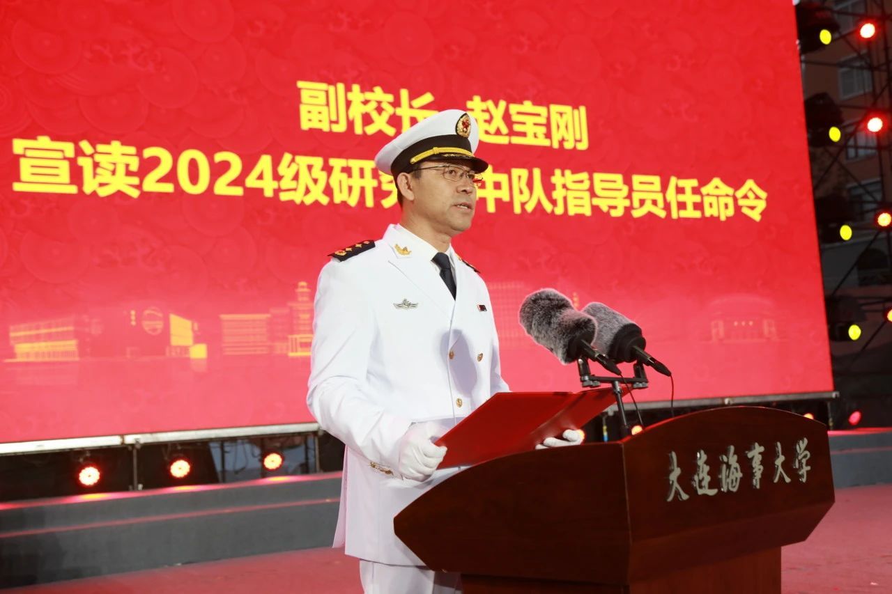副校长赵宝刚宣读《大连海事大学2024级新生中队指导员任命令》,并为本科新生中队授中队旗。