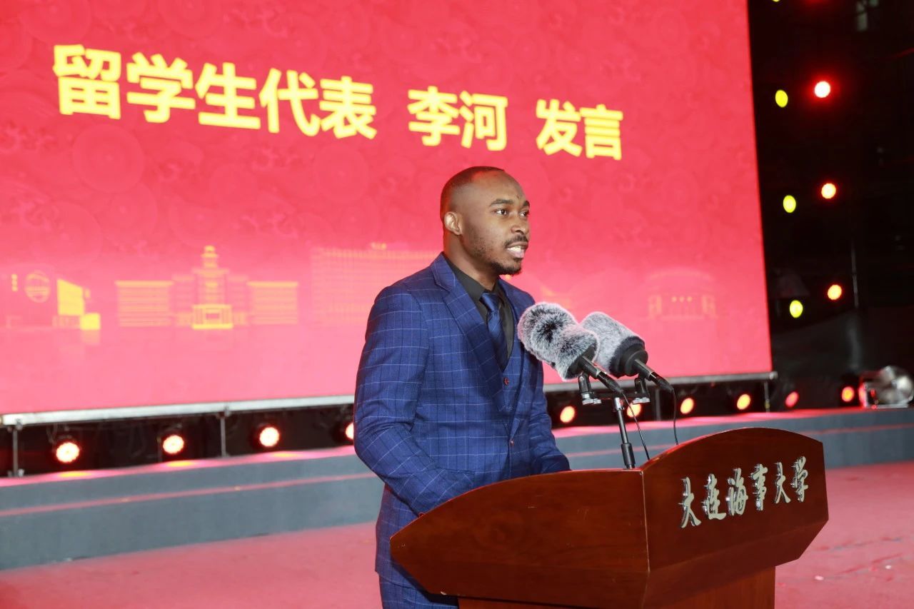 来自刚果(金)的李河同学代表留学生新生发言,他回顾了自己本科期间在海大的成长,见证了中非合作为家乡发展带来的变化,表示将继续努力学习,今后运用所学的知识,为促进中非友好合作贡献力量,他号召同学们携手努力,为构建“人类命运共同体”贡献青春和智慧。