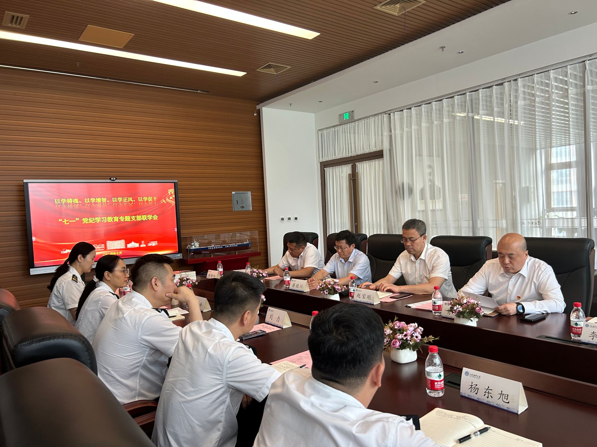 7月12日下午,我校学生就业指导中心党支部、海商法系党支部与辽宁海事局人事教育处党支部在新图书馆四楼会议室联合举办了“七一”党纪学习教育专题支部联学会。辽宁海事局副局长刘力、我校副校长赵宝刚出席会议。