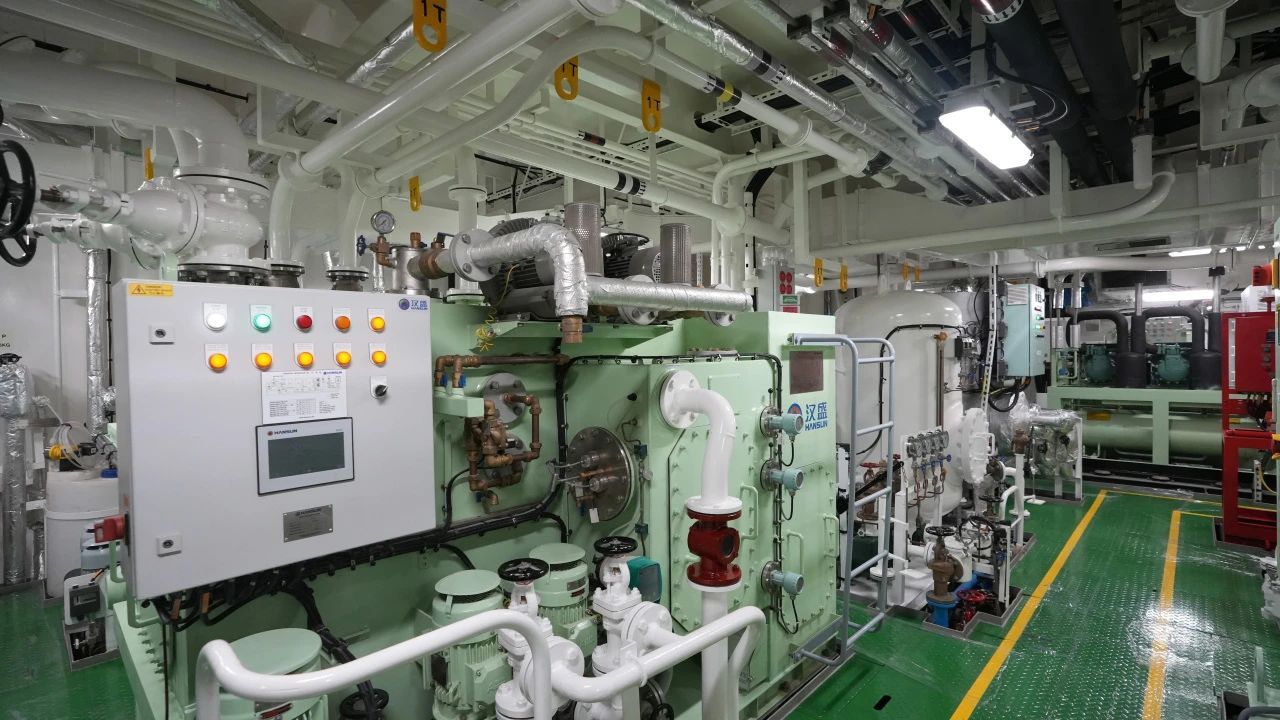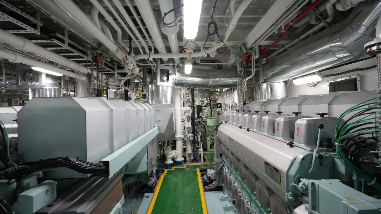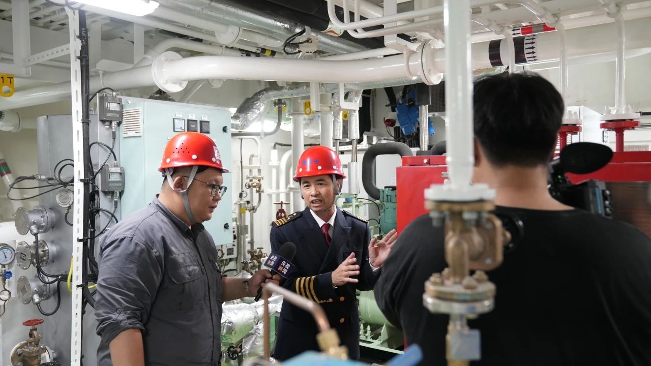 “新红专”轮轮机长张存有教授介绍机舱情况。机舱由四个舱室组成,辅助设备舱主要布置供全船生活、安全、防污染的设备及系统。主机舱安装3台1520kW发电机组,供全船电力和动力用电。配电板间的电站管理系统实现全船用电设备智能化管理。主推进舱配有2台1500kW全回转吊舱推进器。全船动力设备配备智能传感器,可对设备健康状态进行评估和预测,使系统运行更安全、可靠、节能、环保。
