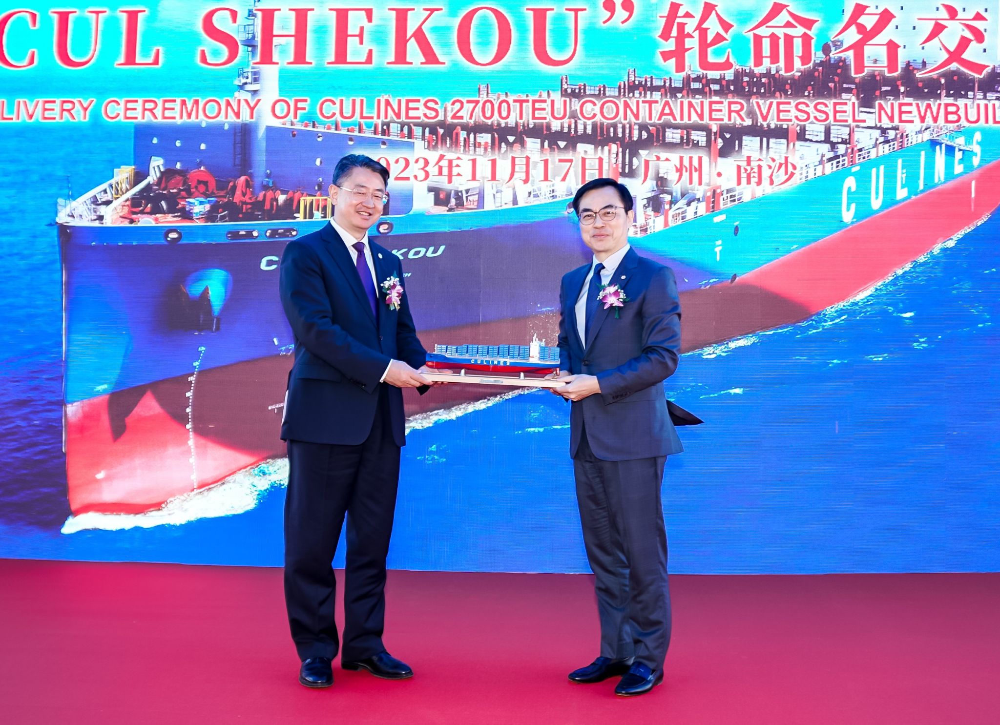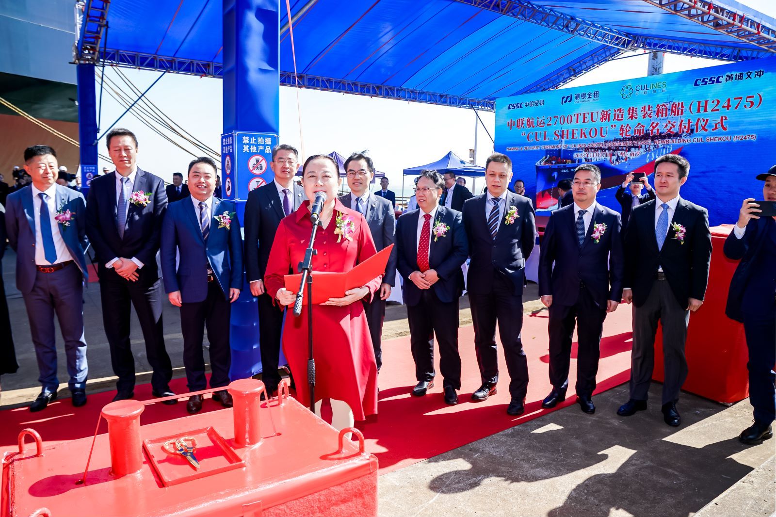 11月17日上午,校长单红军出席中联航运股份有限公司在中船黄埔文冲船厂举行的2700TEU新造集装箱船“CUL SHEKOU”轮命名交付仪式并致辞。