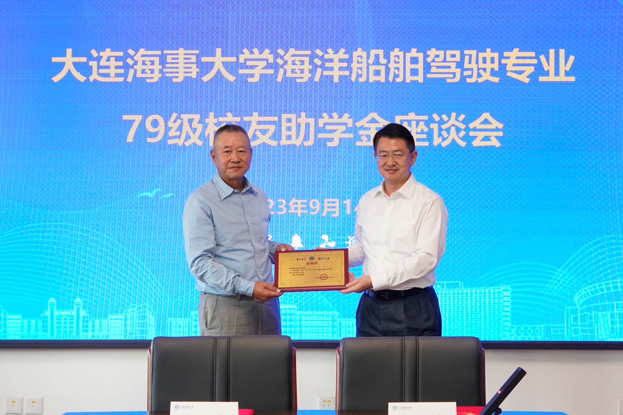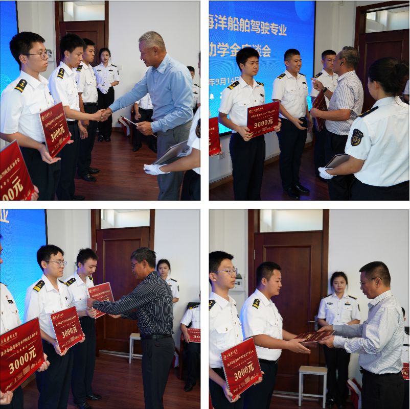 随后,单红军向校友代表颁发纪念牌,航海学院党委书记刘益迎向校友颁发纪念品,校友为受助学生颁发助学金并共同观看助学金十年回顾视频。