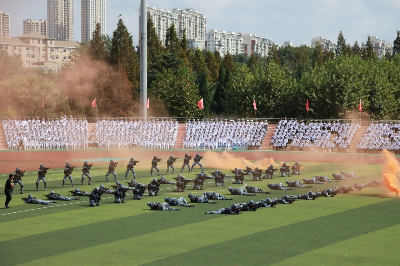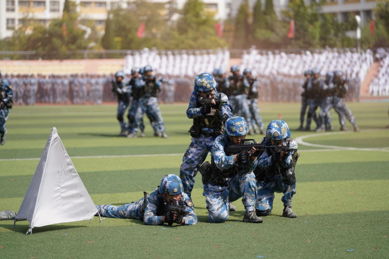 此次军训成果汇报,设置了分列式、队列歌咏、战术方阵、军体拳等展示内容。