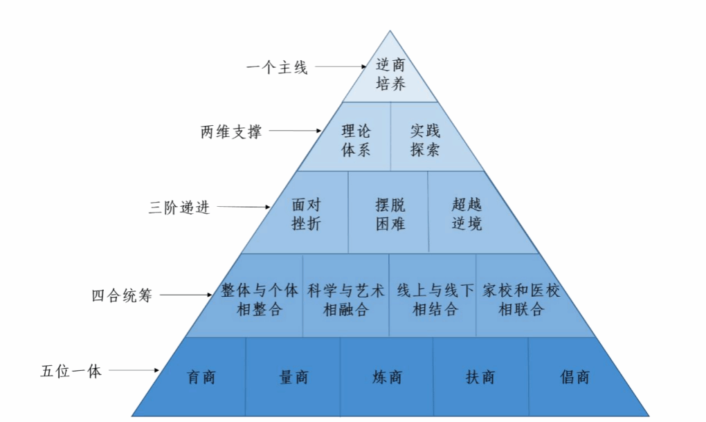 “1”即一个主线:确立以逆商培养为心理育人主线;“2”即二维支撑:坚持理论研究与实践活动并重;“3”即三阶递进:将逆境成长划分为面对挫折、摆脱困难和超越逆境三个阶段,实现逆商水平逐阶递进;“4”即四合统筹:建立整体与个体相整合、科学与艺术相融合、线上与线下相结合、家校与社医相联合的工作机制;“5”即五位一体:形成“育商、量商、炼商、扶商、倡商”五位一体的工作路径。