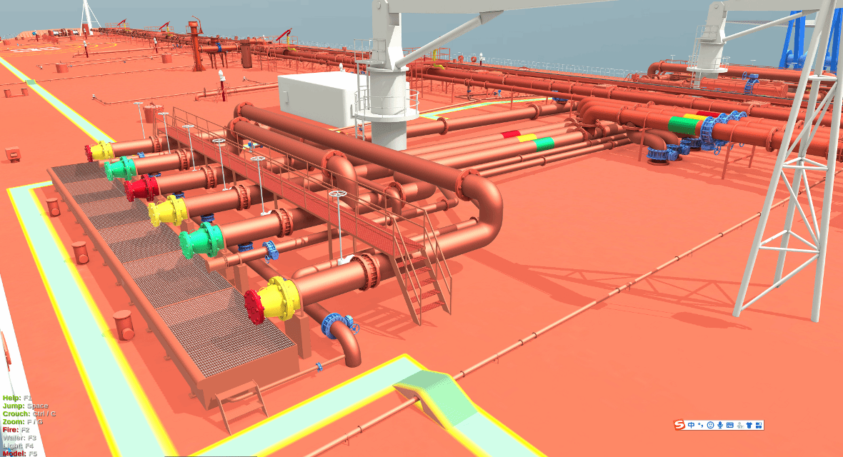 液货装卸虚拟仿真教学实验室以液货船舶货物装卸设备操作为切入点,选取液化气船舶、散装化学品船舶、油轮船舶上的装卸货设备,充分利用虚拟现实等计算机仿真技术,实现液货船设备教学与训练的信息化、网络化和三维情景化。实验室具有高度逼真立体还原船舶实际场景,全任务、高沉浸感的虚拟交互操作和设备原理动画相结合,以学生为中心的自主化和案例化学习等特色。