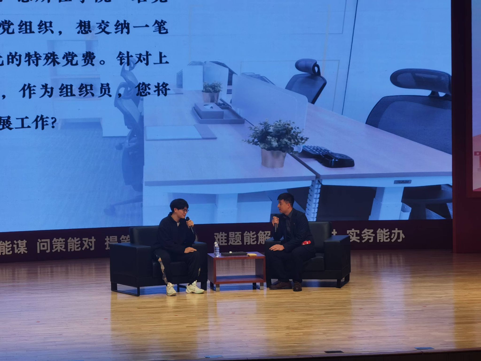 比赛共分为两个阶段,在第一阶段的比赛中,王恩思、宋一凭借扎实的基础理论知识和业务能力,顺利晋级决赛,并在次日的主题党课展示和工作情景模拟环节,通过两堂精彩的情景式党课展示和细致入微、全面准确的问题解析,获得了评委的高度认可,取得优异成绩。
