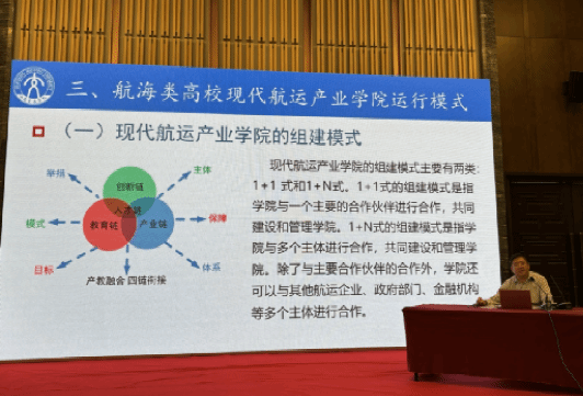 在论文交流环节,大连海事大学邢辉和山东交通学院于洋分别就复合型航海类人才培养和现代航运产业学院实践等主题进行交流。