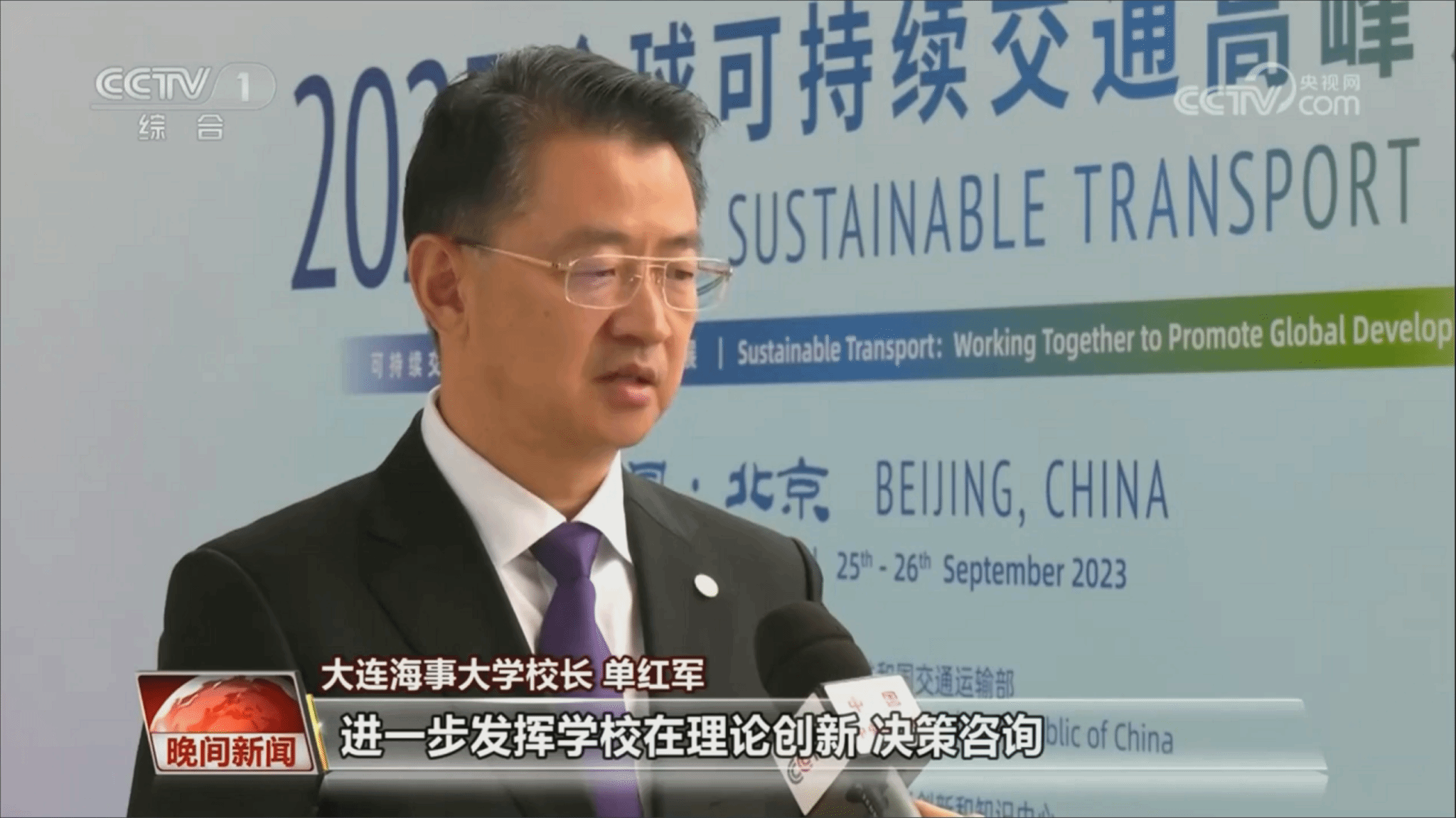 论坛期间,校长单红军接受央视采访。他表示,习近平总书记的贺信,高屋建瓴、意义深远,同习近平总书记关于可持续交通的系列重要指示精神一脉相承,为可持续交通发展和全球交通合作指明了前进方向、注入了强大动力。贺信中“人享其行、物畅其流”的美好愿景、“与世界相交、与时代相通”的重要理念,振奋人心、鼓舞斗志,为我们加快建设交通强国、努力当好中国式现代化的开路先锋凝聚起磅礴力量。他强调,作为一所具有鲜明航运、海事、海洋特色的国家“双一流”建设高校,大连海事大学将深入学习贯彻习近平总书记贺信精神,紧紧围绕建设安全、便捷、高效、绿色、经济、包容、韧性的可持续交通体系,进一步发挥学校在理论创新、决策咨询、人才培养、国际合作等方面的优势,全力打造中国特色新型高端智库,努力在交通、海事、海洋等领域取得一批创新成果,为强国建设、民族复兴贡献海大力量。