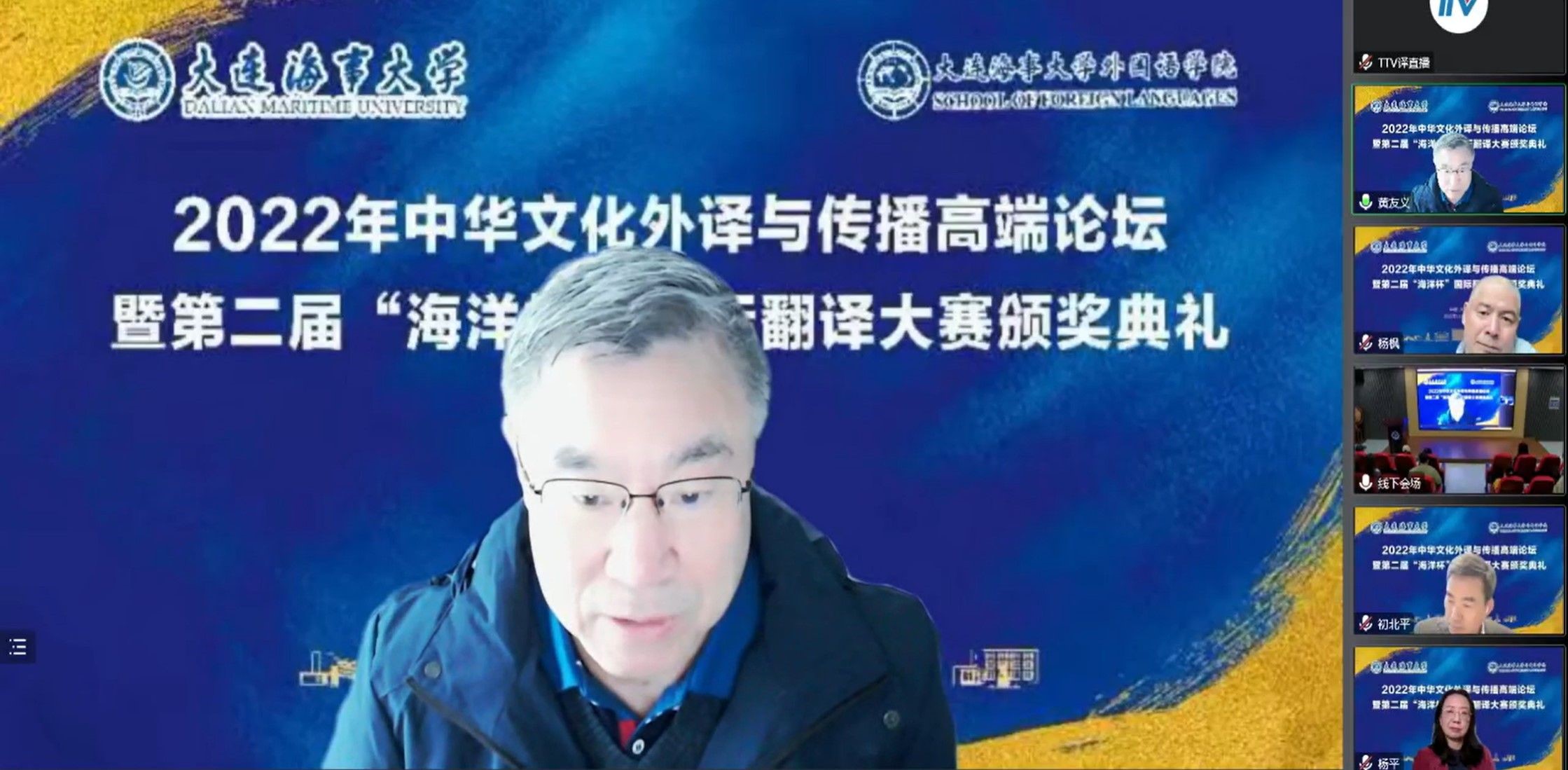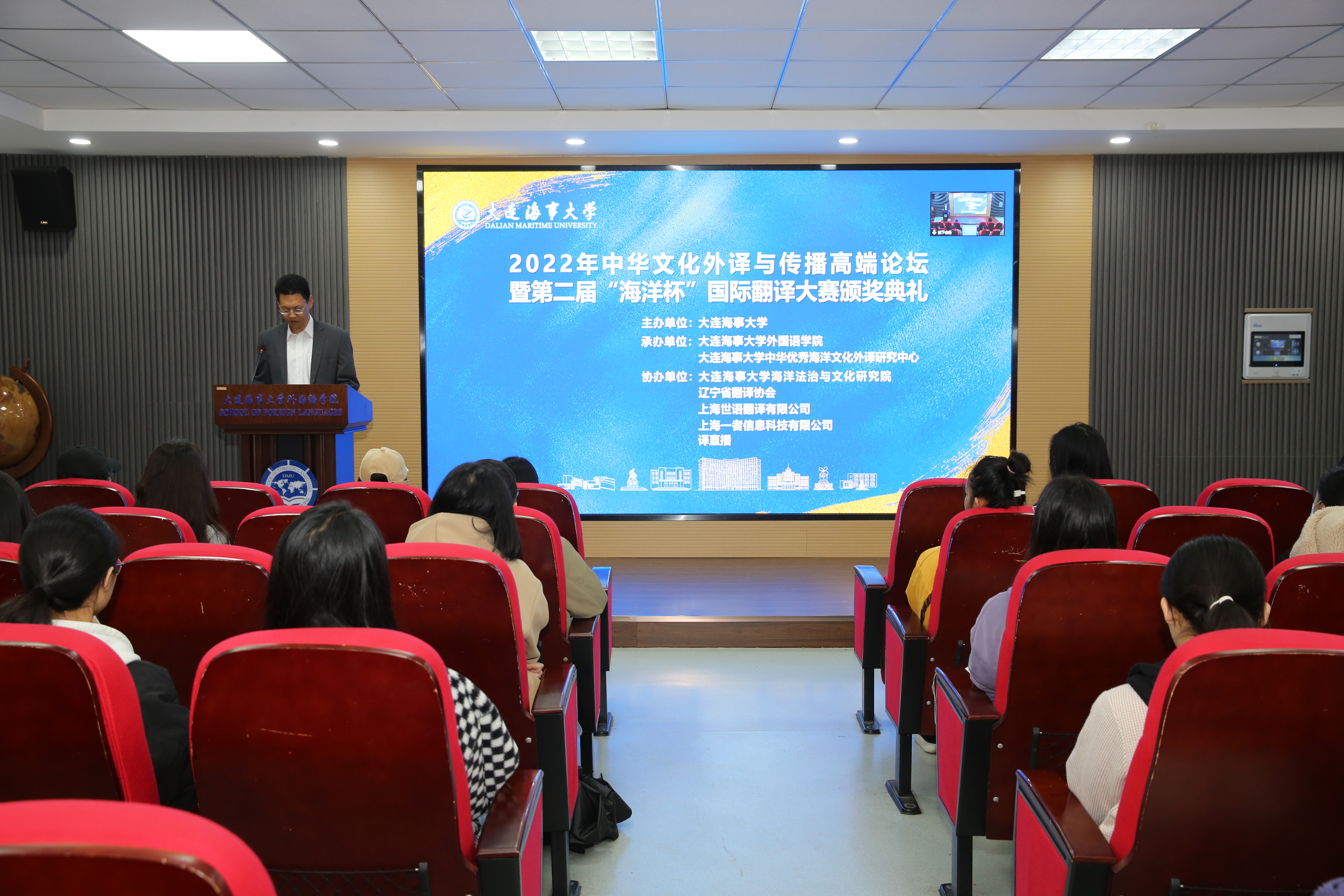 11月11至12日,“中华文化外译与传播高端论坛暨第二届‘海洋杯’国际翻译大赛颁奖典礼”在我校召开。本次论坛由大连海事大学主办,大连海事大学外国语学院、大连海事大学中华优秀海洋文化外译研究中心承办,大连海事大学海洋法治与文化研究院、辽宁省翻译学会、上海世语翻译有限公司、上海一者信息科技有限公司、译直播协办,旨在进一步加强国家高端智库培育建设,深入开展中华优秀文化外宣外译研究,弘扬传承中华优秀传统文化,有效服务中华优秀文化“走出去”战略,扩大国际影响、提升国家形象,讲好中国故事,将社会主义核心价值观融入于交流的主体人,体现于交流的客体物,通过承载中华优秀传统文化的人和物,最大限度地彰显中华文化的亲和力,赢得国际社会的理解和认同,巩固新时代中国文化价值体系的国际地位。