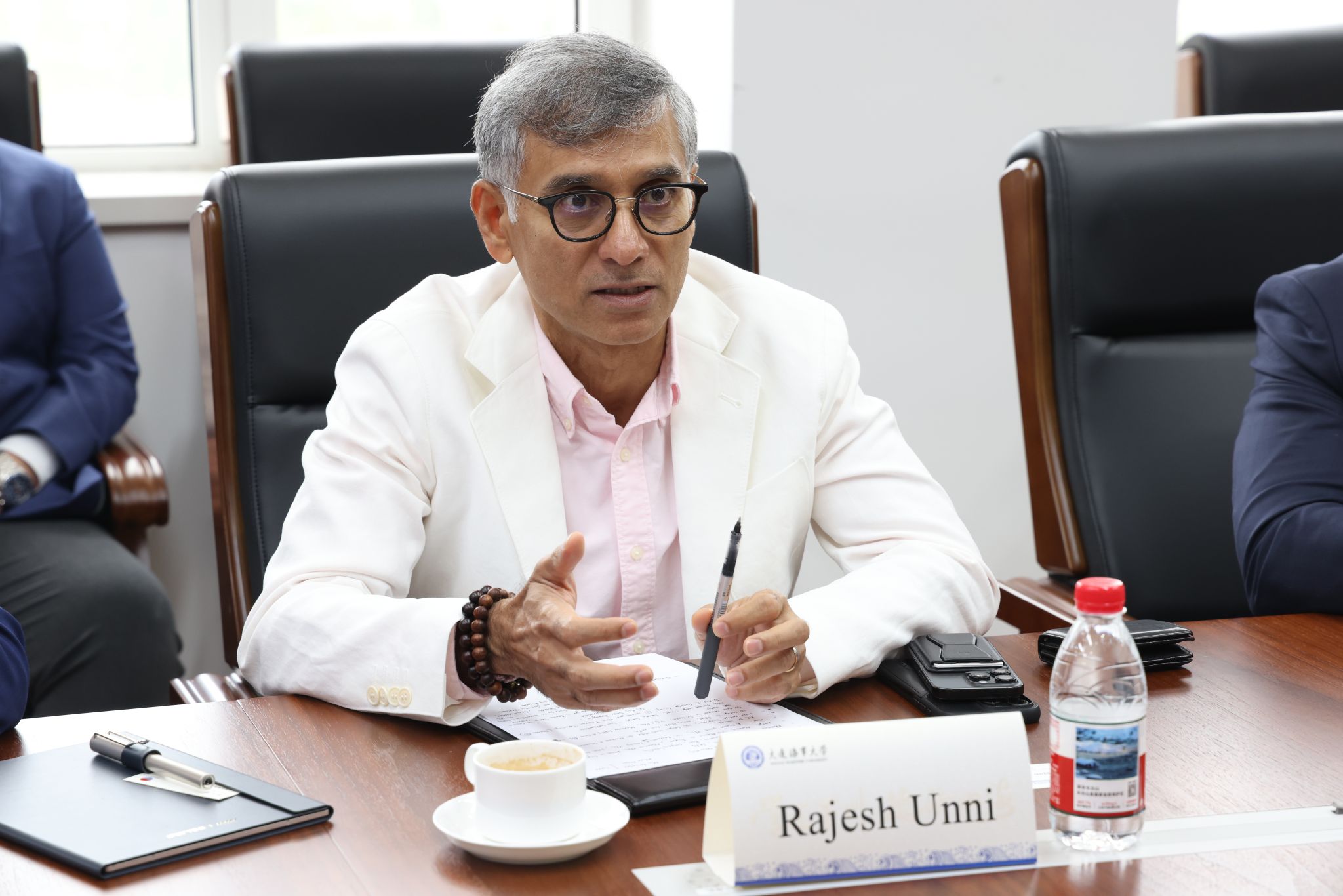 单红军对Rajesh Unni一行的到访表示欢迎,并简要介绍了学校的历史沿革、办学特色、人才培养、科技创新及国际合作等情况。他表示,学校始终坚持开放发展,重视国际合作交流,希望通过Rajesh Unni一行来访为契机,开启双方在智能航海人才培养、人员交流访问、智能航运平台共建、国际化培训等方面的交流合作,共同为全球海事行业可持续发展和智慧化转型作出积极贡献。
