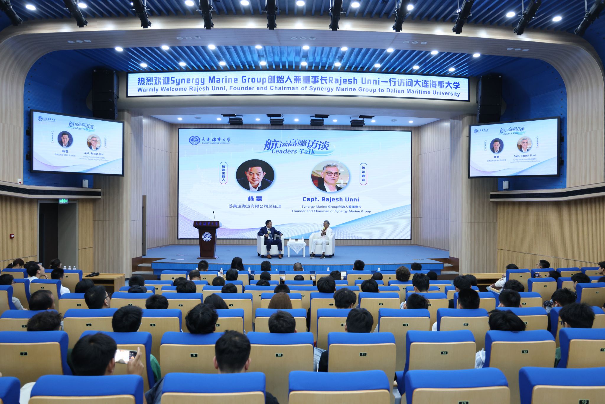 座谈后,学校在中远报告厅举办了“对话Synergy Marine Group创始人兼董事长Rajesh Unni船长”航运高端访谈活动,苏美达海运有限公司总经理、我校2000级校友杨磊担任访谈主持人。访谈中,Rajesh Unni船长分享了他从远洋实践中提炼出的“幕后领导力”理念,强调赋能团队、优势聚焦和坦诚沟通的重要性。面对航运业未来发展,他着重分享了脱碳转型和人机协作等前沿议题。我校师生就海事人才培养及行业需求等话题与来访嘉宾进行了交流。