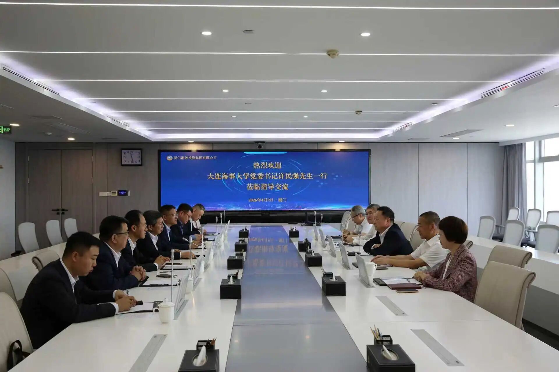 在厦门港务控股集团有限公司,集团党委副书记、副董事长、总经理陈朝辉,副总经理吴岩松等会见许民强一行并座谈交流。双方回顾了前期合作成果,介绍了各自“十五五”发展规划情况,并就智慧港口、绿色港口科研项目合作,企业人员教育培训教学点设置,联合申报科研项目与咨政建议等合作达成共识。座谈会上,双方还围绕港口群协同发展、东南陆海新通道等课题进行了交流。