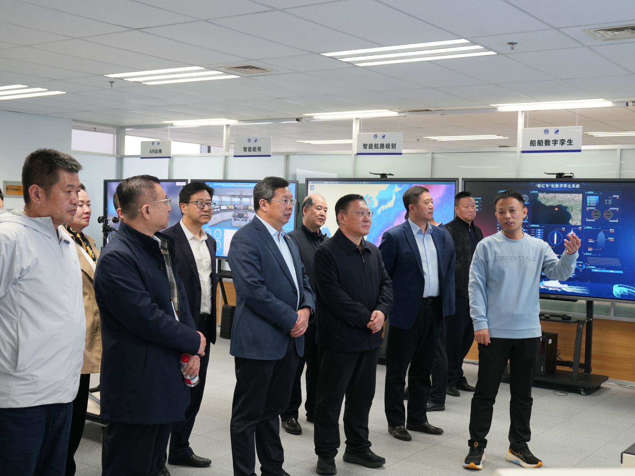 郝明一行先后前往学校智海楼智慧海洋信息科技公共创新平台、豪之英科技大厦船舶导航系统国家工程研究中心、智能船舶岸基数智运控中心,实地察看科研平台建设运行情况,详细听取水下机器人研制应用、国产化船舶交通管理系统研发、“新红专” 轮岸基远程管控与智能船舶关键技术攻关等成果汇报,全面了解学校在海洋信息、智能导航、航运数字化等领域的技术突破与产业应用成效。各点位负责人分别就技术攻关、产学研融合、服务国家战略等情况作详细介绍。
