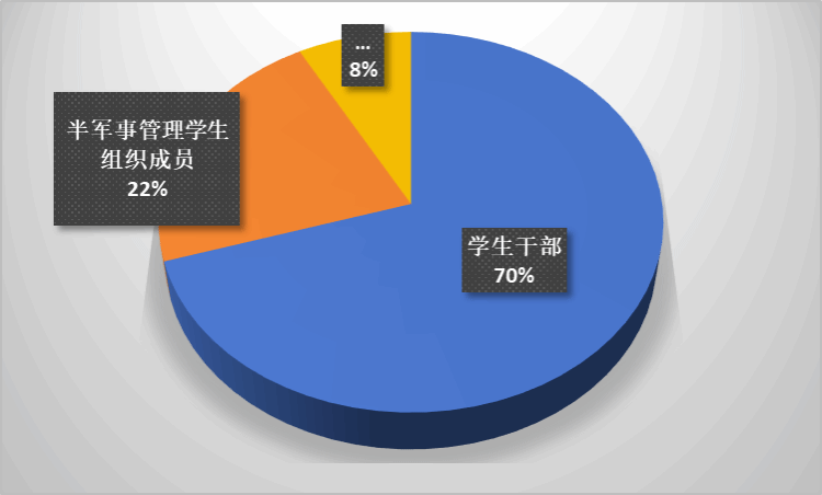 据统计,本期暑期军政骨干培训班共包含187名同学,他们来自于14个学院和半军事管理学生委员会、国旗护卫队、国防教育学生委员会、军乐团等学生组织。经过个人报名、中队推荐、学院初选和学校复核,成为本期培训班的一员。其中,有70.21%的学生担任中队、班级、学生组织的干部,有21.8%的学生为半军事管理学生组织成员,学生骨干平均绩点3.4以上,最高绩点为4.45。