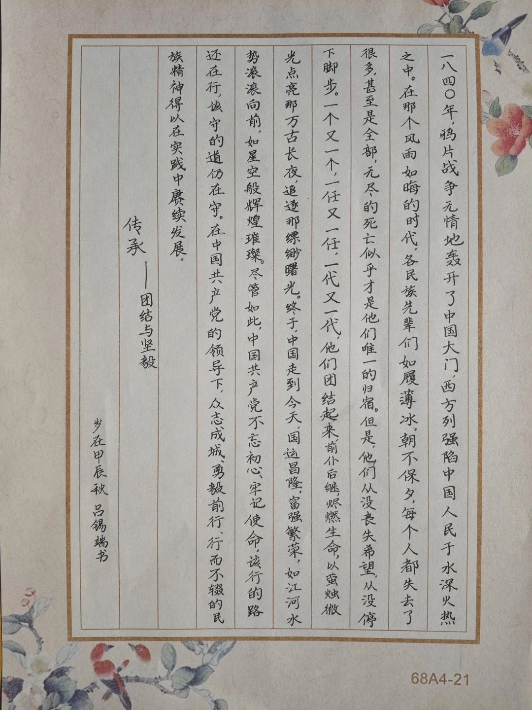 笔墨丹青迎国庆,学院开展“我为祖国书华章”庆祝中华人民共和国成立75周年主题书法和征文活动。活动中,大家紧密围绕迎国庆、颂华章、爱祖国、绘发展、等主题,用饱含深情的笔墨和不同的创作笔法,把“爱国”两字烙在笔墨间,一幅幅风格独具、韵古气新的书法作品巧夺天工,用无声的语言歌颂中华人民共和国成立以来的丰功伟绩。一段段热情洋溢的文字,一个个感人肺腑的爱国故事传递着莘莘学子的拳拳爱国心。