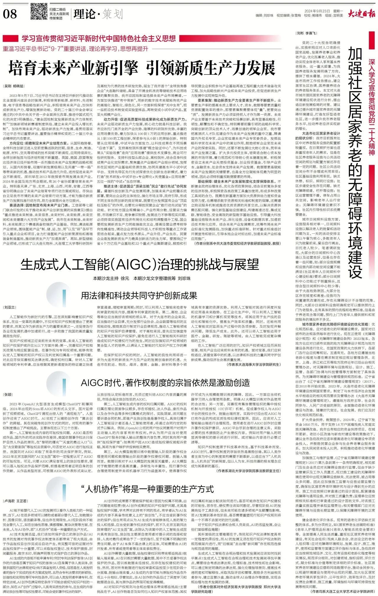 为了贯彻落实党的二十届三中全会精神,宣传国家在新技术领域的知识产权政策,近日,大连海事大学知识产权研究院、大连高新区技术与创新支持中心(TISC)和大连日报社联合举办了《生成式人工智能(AIGC)治理的挑战与展望》笔谈学术沙龙活动,邀请国内高校的学者和实务律师就人工智能的全球治理和对知识产权制度的影响与规制等相关问题进行探讨。大连海事大学法学院教授、知识产权研究院执行院长、高新区TISC负责人徐元主持本次笔谈沙龙活动。